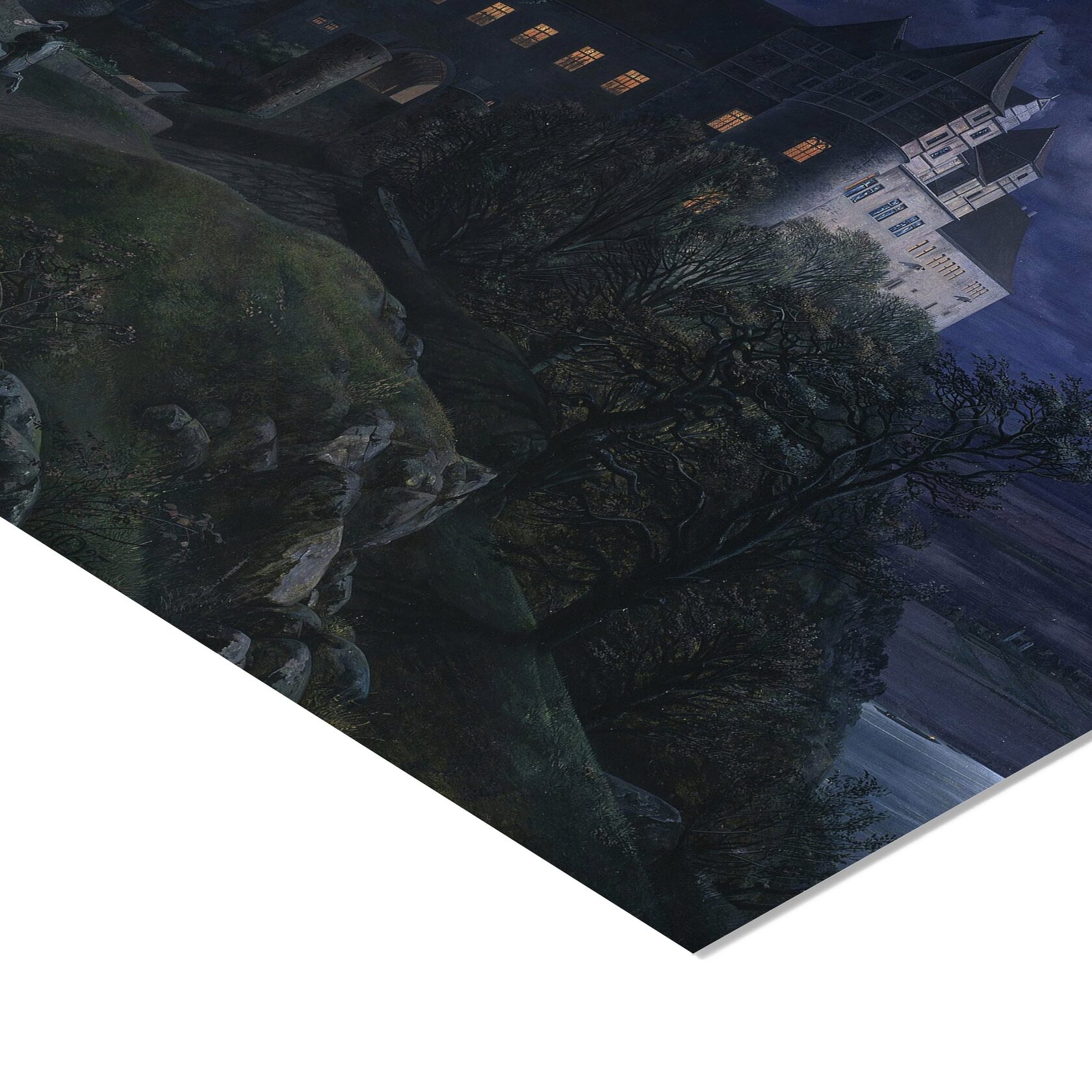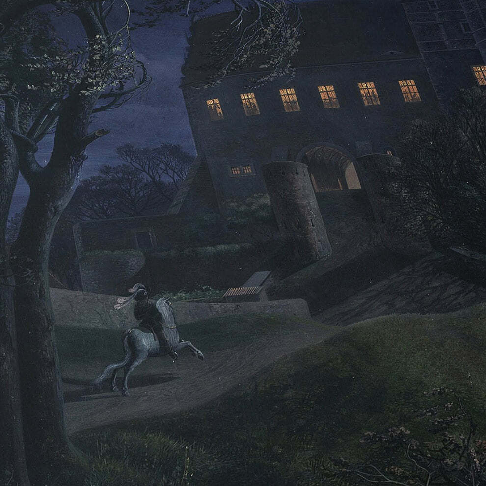 На фоне холодной ночи замок сияет тёплым светом, а к нему мчится одинокий всадник. Благодаря этому образу пейзаж перестаёт быть просто видом — он превращается в символическое путешествие в средневековую мечту.