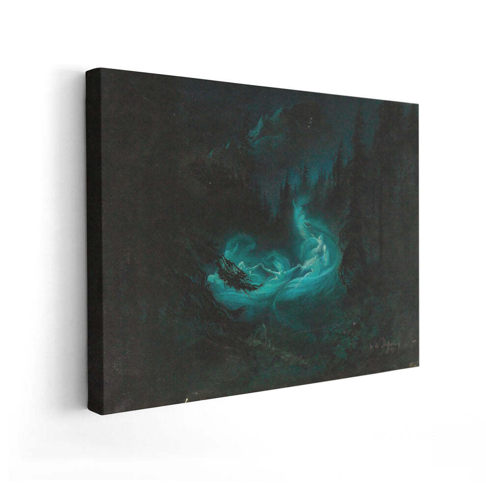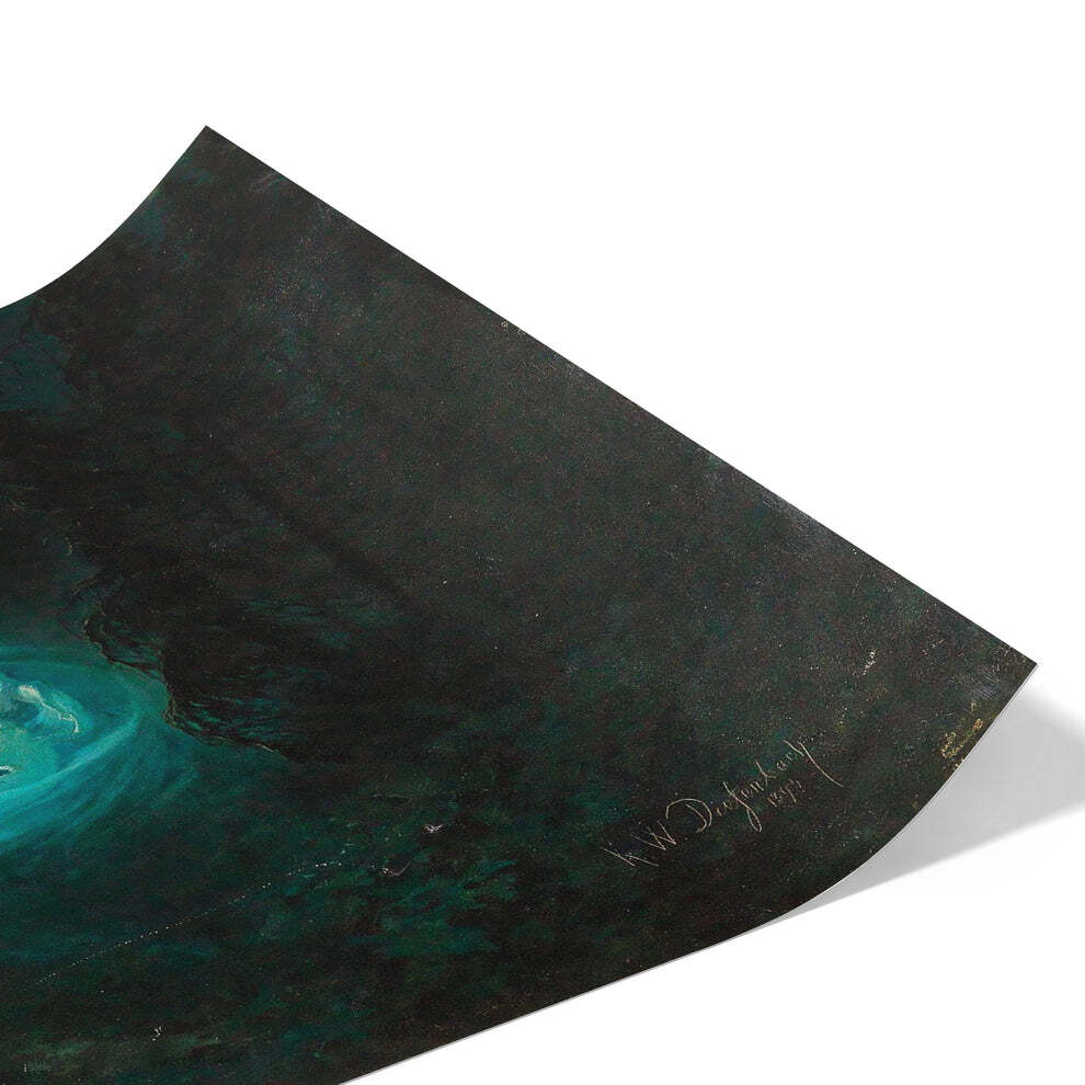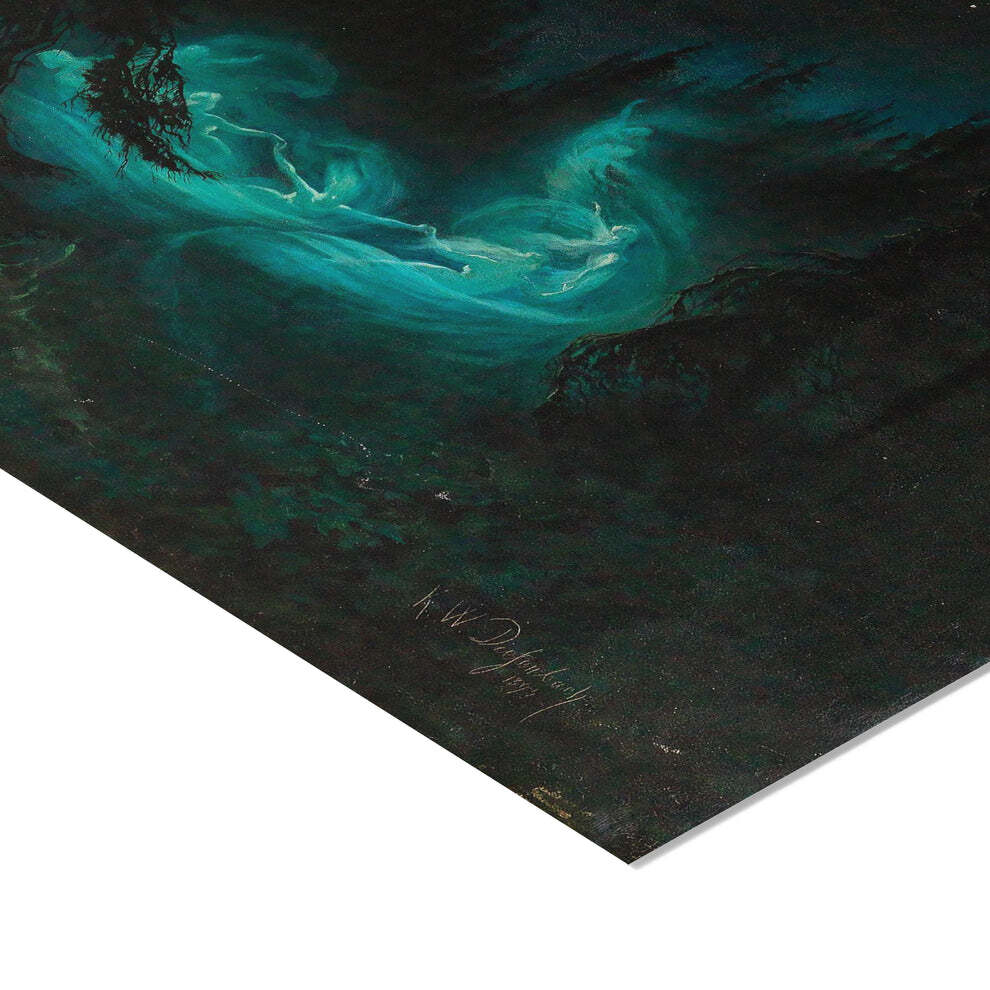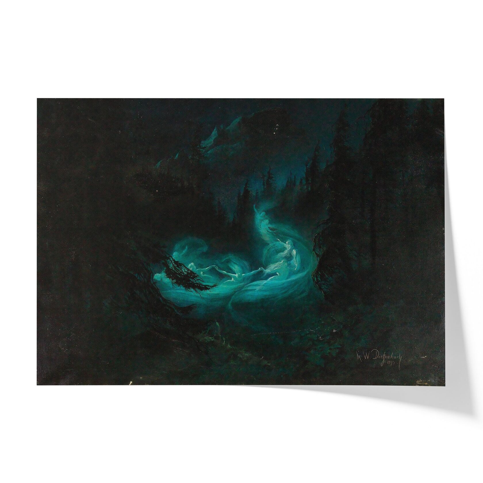О работе: Карл Вильгельм Дифенбах в Танце фей (1895) вызывает видение сверхъестественного как отражение скрытых сил внутри природы. Светящиеся фигуры, пойманные в вечном круге движения, намекают на безвременный ритм жизни, смерти и возрождения, словно сам лес оживает и празднует свою собственную тайну. Их призрачное сияние контрастирует с окружающей тьмой, вызывая напряжение между материальным и духовным, видимым и невидимым.