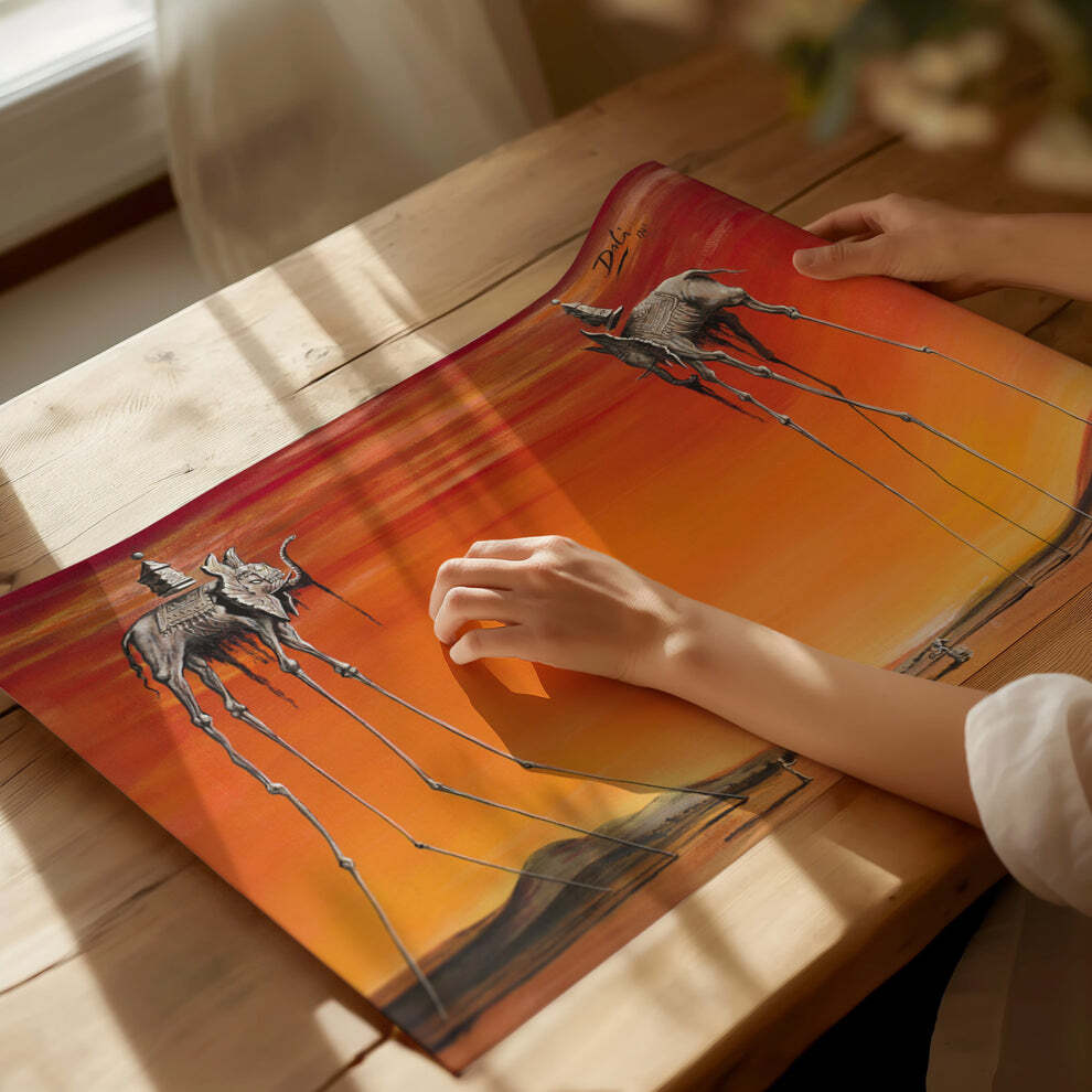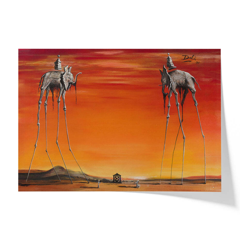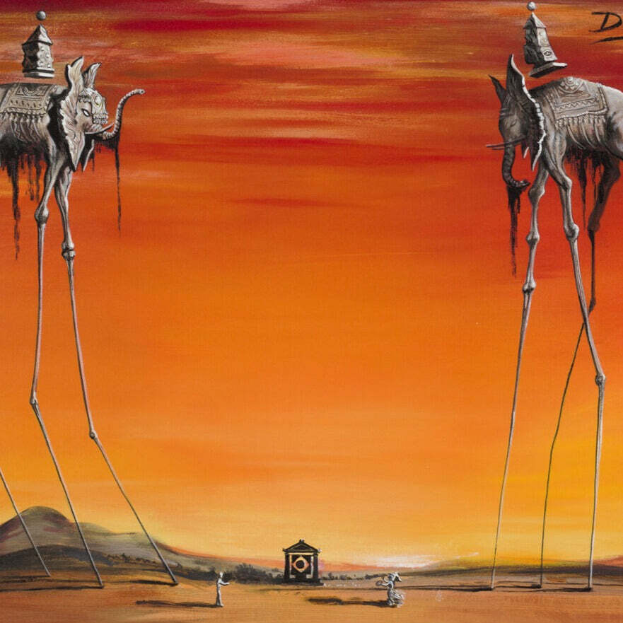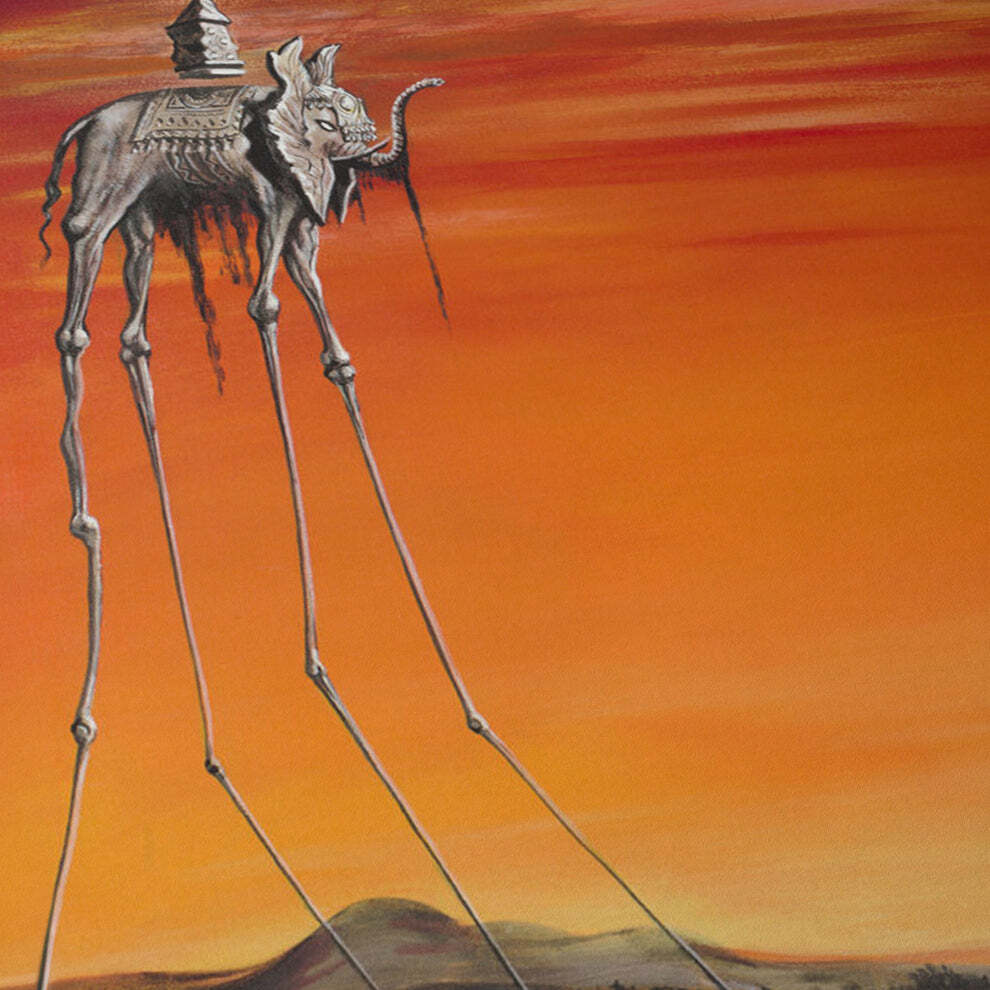 «Слоны» Сальвадора Дали — яркий пример его безграничного воображения и сюрреалистического гения. На полотне изображены стройные, нереально длинноногие слоны, несущие на своих спинах массивные обелиски. Эти хрупкие на первый взгляд создания словно бросают вызов законам физики, символизируя противостояние тяжести и невесомости.