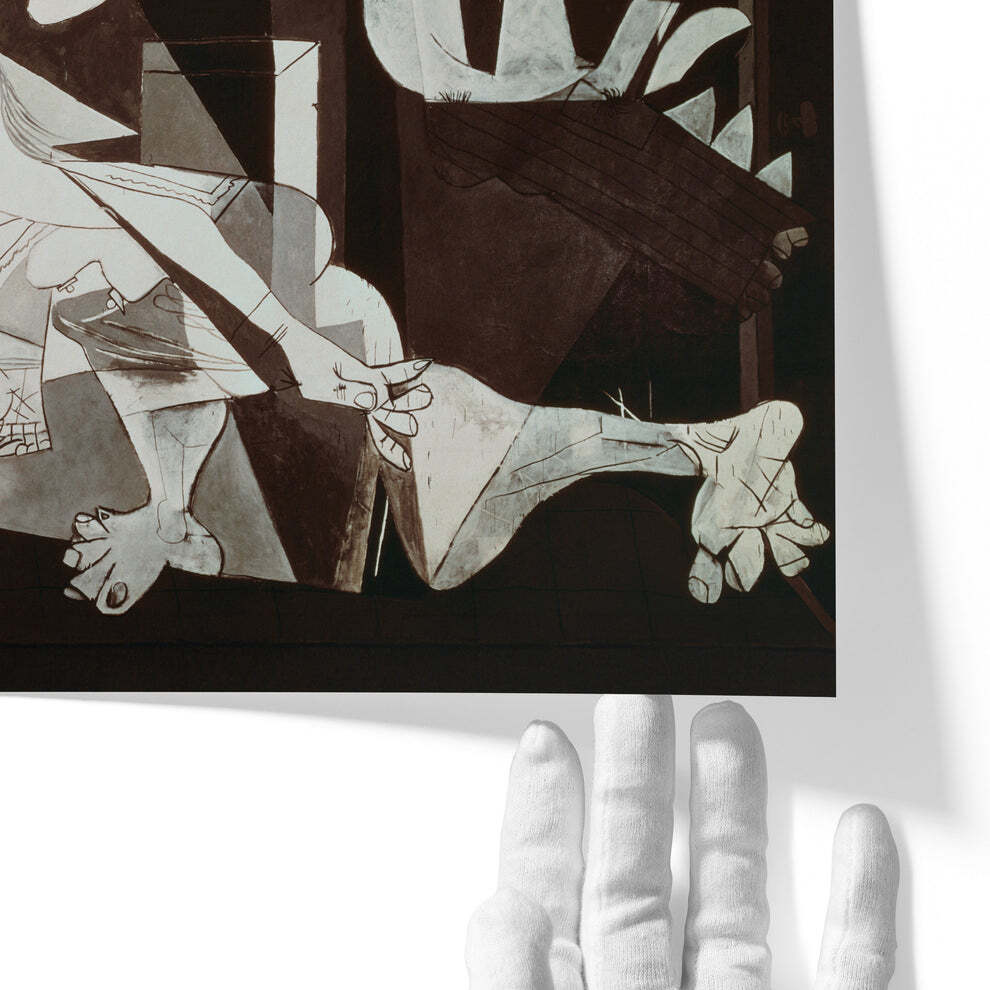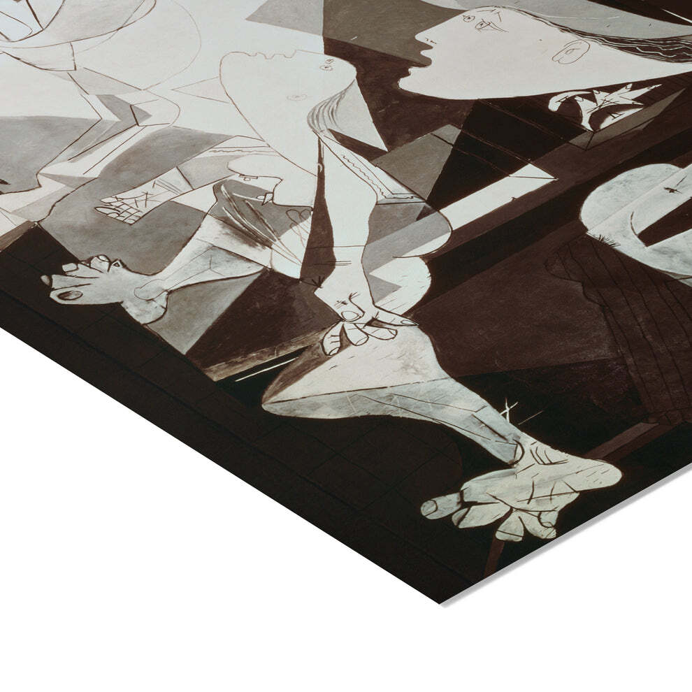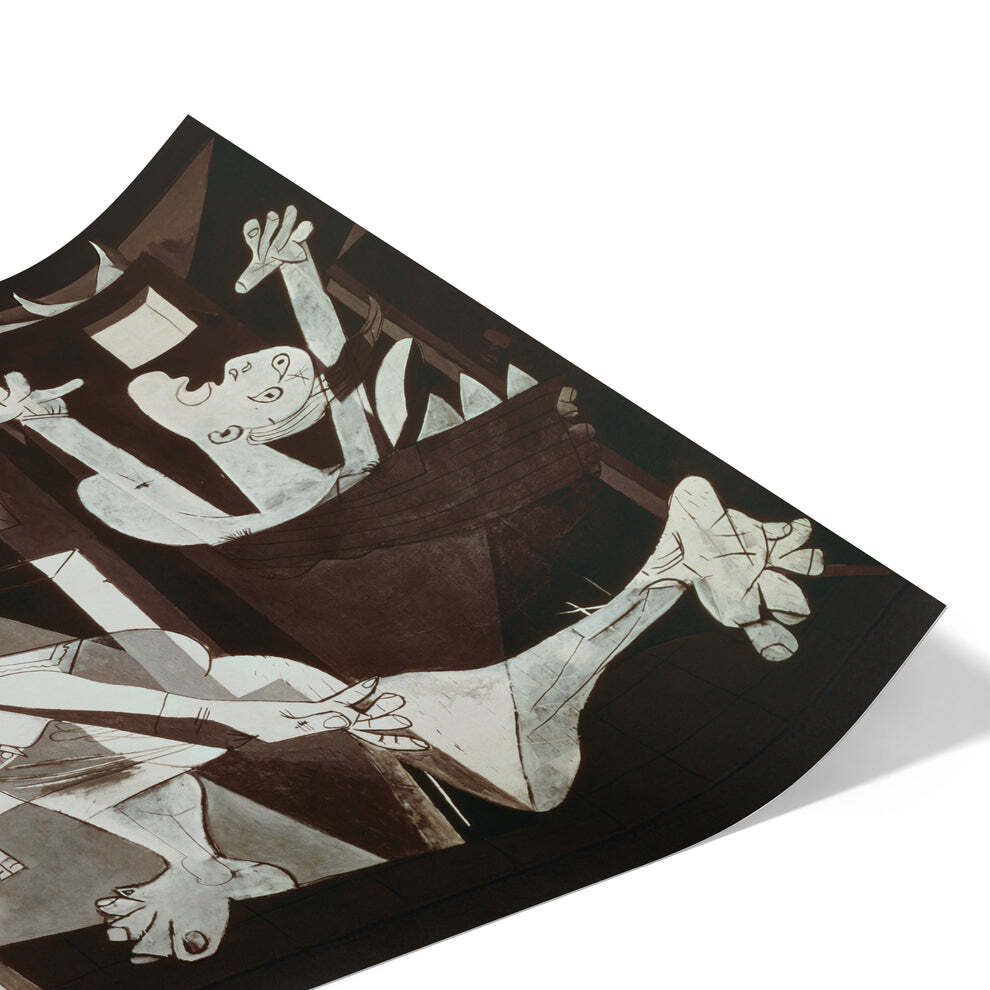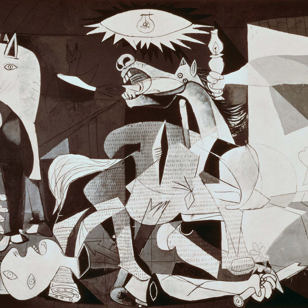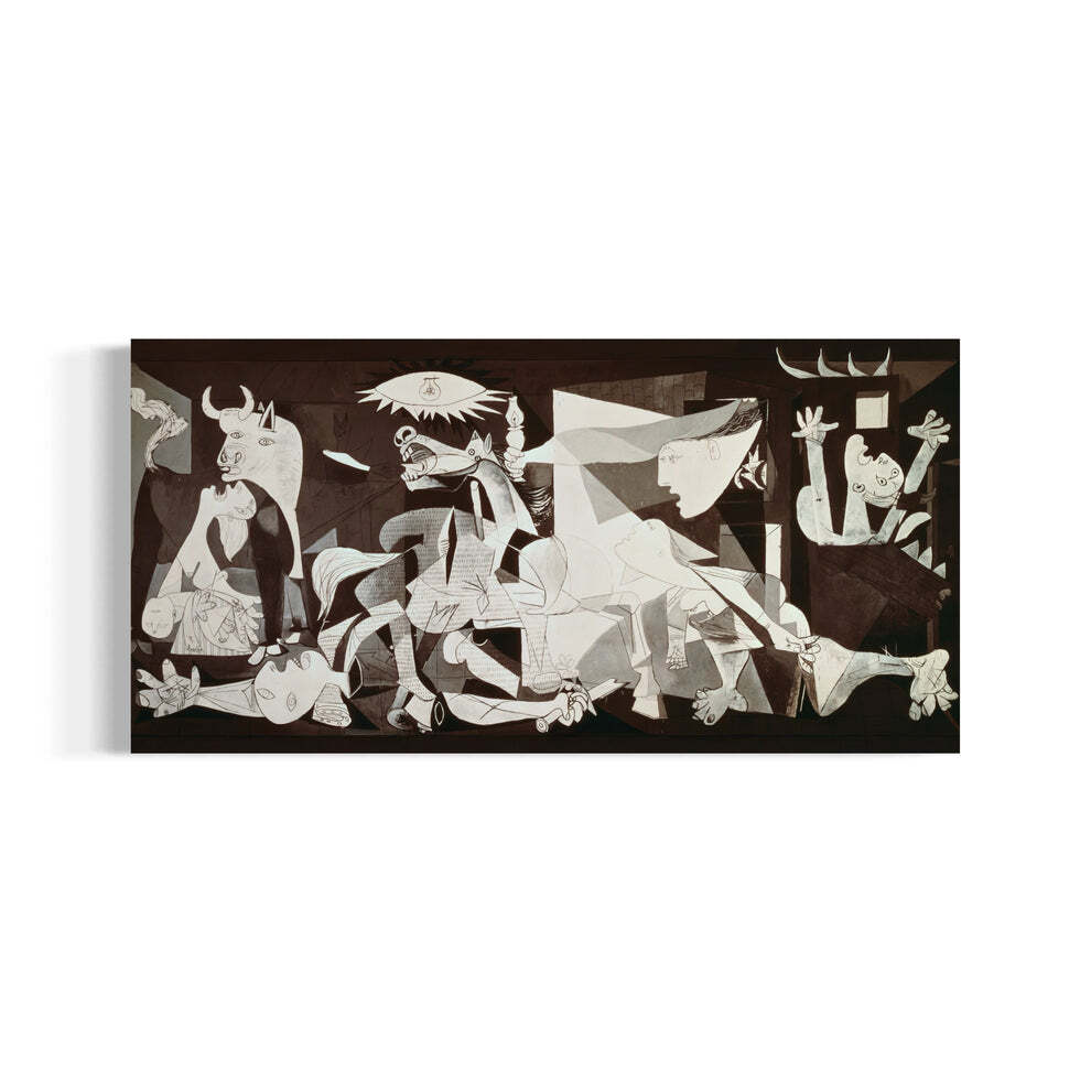 О картине: "Герника» Пабло Пикассо — это монументальное антивоенное высказывание, рожденное из ужаса бомбардировки баскского города Герника во время Гражданской войны в Испании. В резких черных, белых и серых тонах Пикассо создает хаотическую сцену, наполненную фрагментированными фигурами — кричащая женщина, прижимающая мертвого ребенка, павший воин с переломанным мечом, бык и испуганная лошадь — все они искажены страданием.