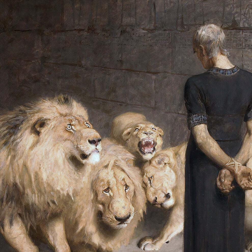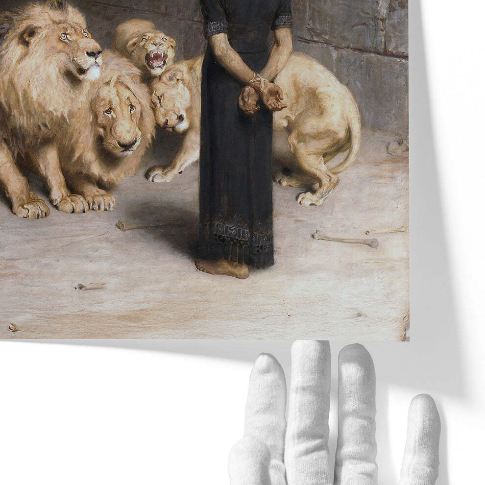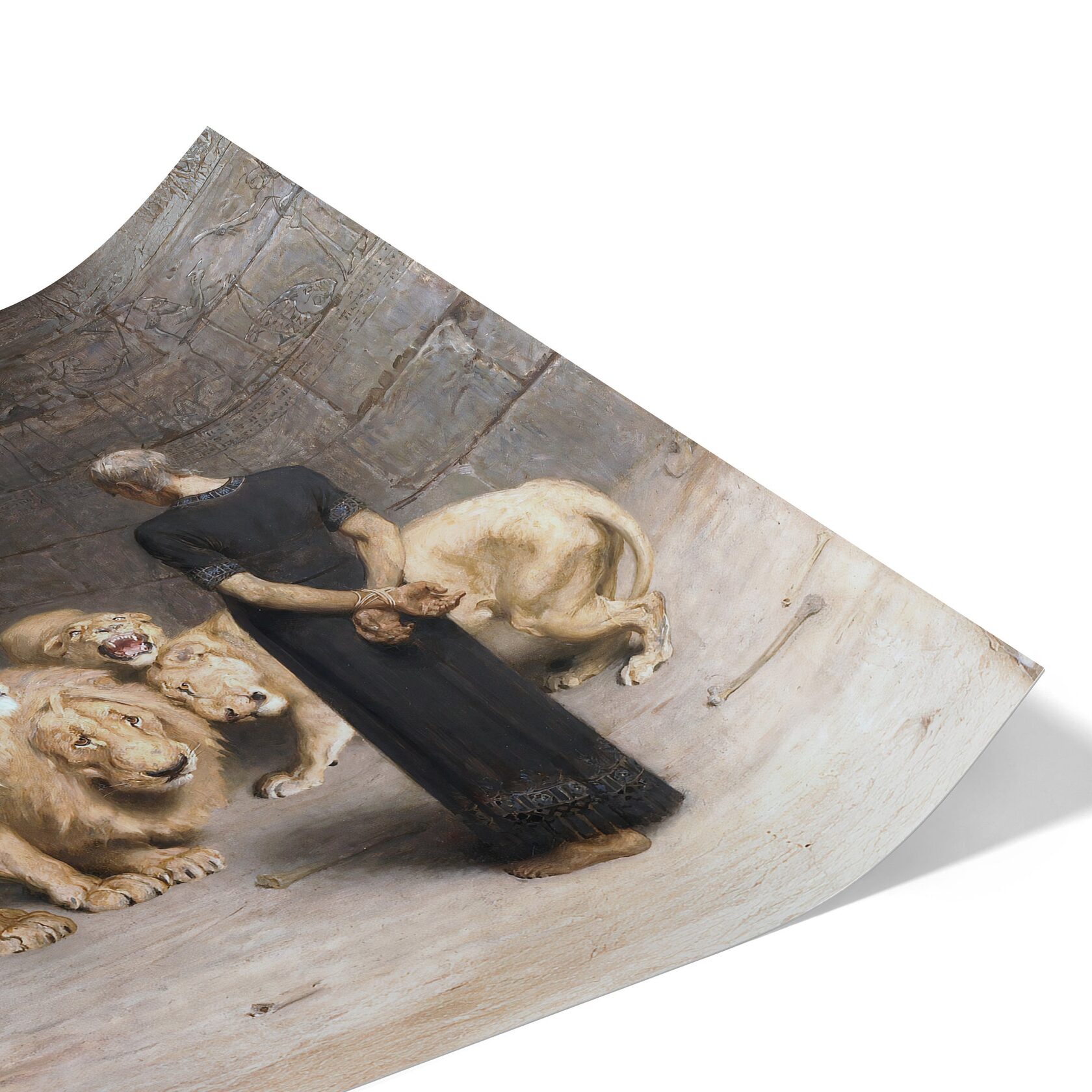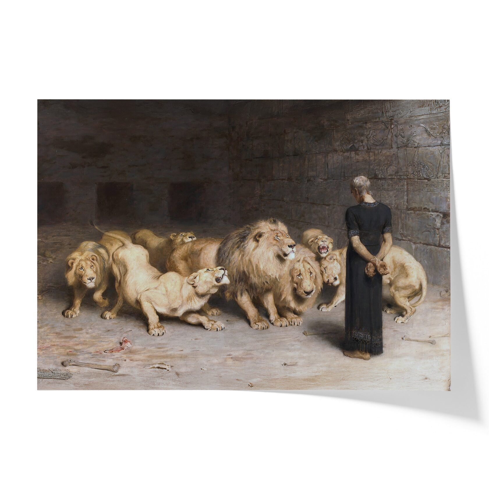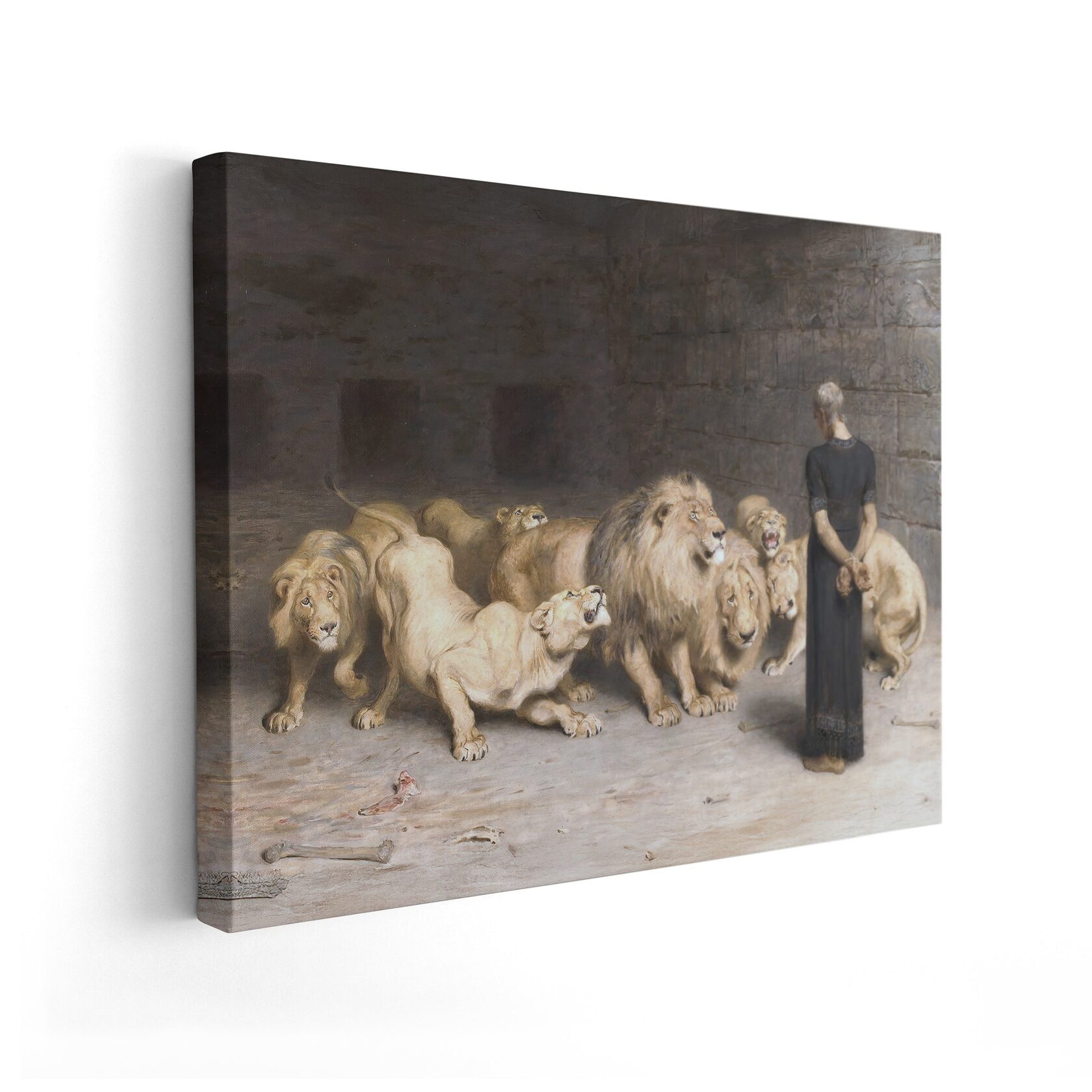 О картине: В этом шедевре 1872 года Ривьер отказывается от драматизма и чудес, выбирая вместо этого момент глубокой неподвижности. Даниил, босой и связанный, стоит спиной к зрителю, с опущенной головой и руками, спокойно скрещёнными за спиной, окружённый прайдом львов, чьи выражения лиц варьируются от любопытства до тихого сдержанности. Львы — написанные с поразительной анатомической точностью — выглядят встревоженными, но подавленными; их сдержанность почти более страшна, чем открытая агрессия. Разбросанные по полу кости напоминают о смертельной природе этого места, и всё же спокойствие Даниила, кажется, властвует в этой сцене.