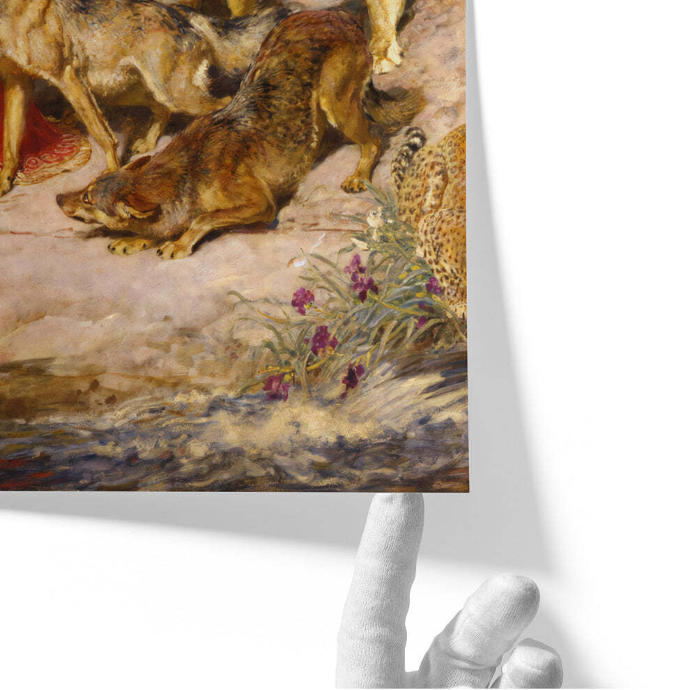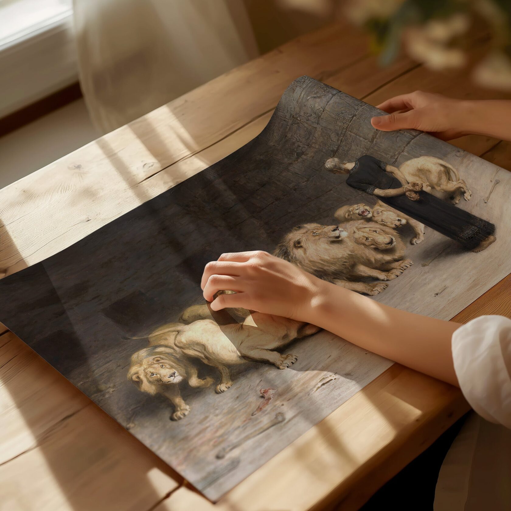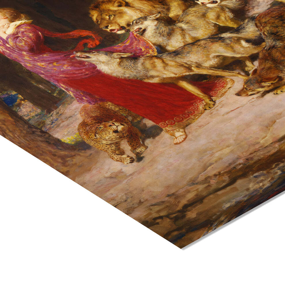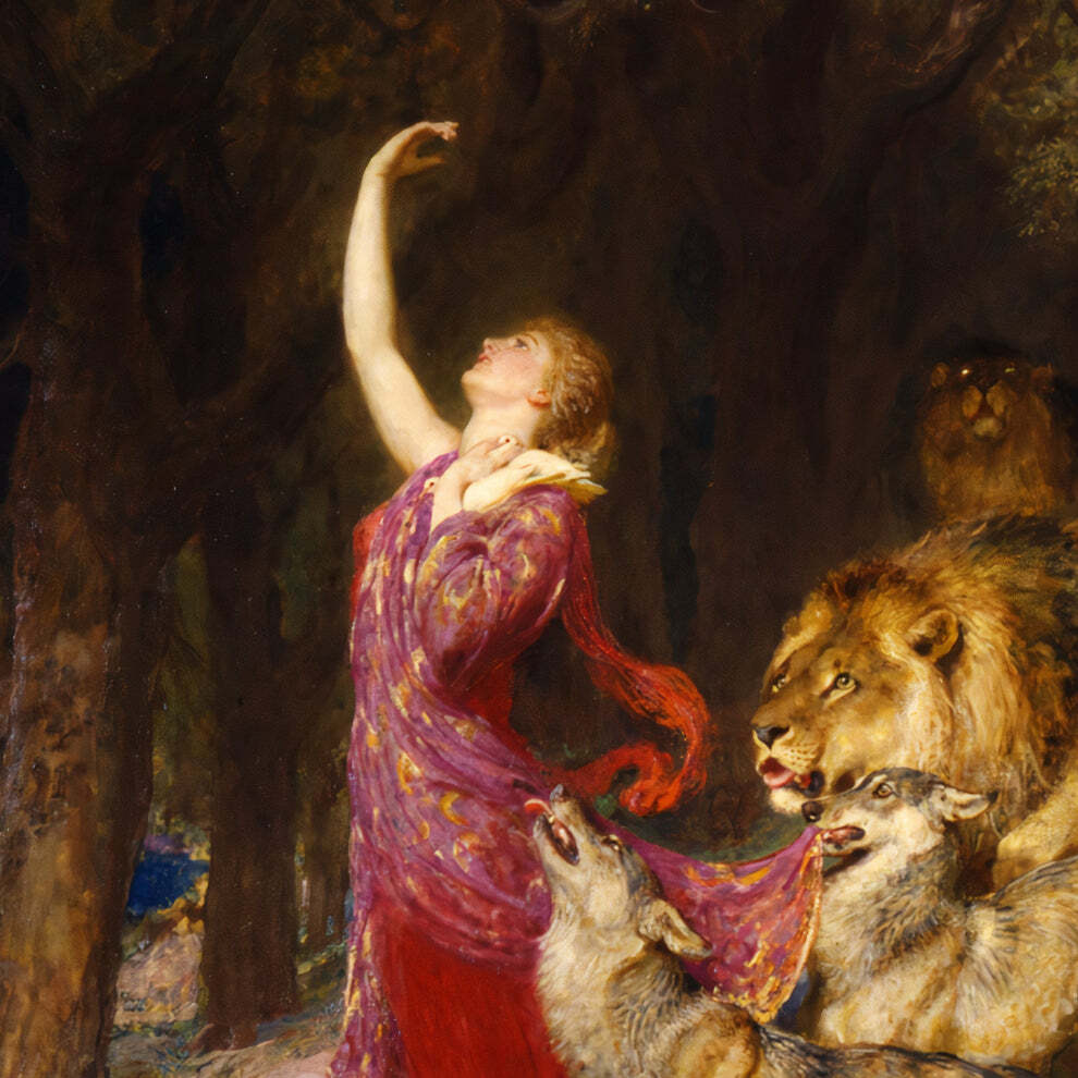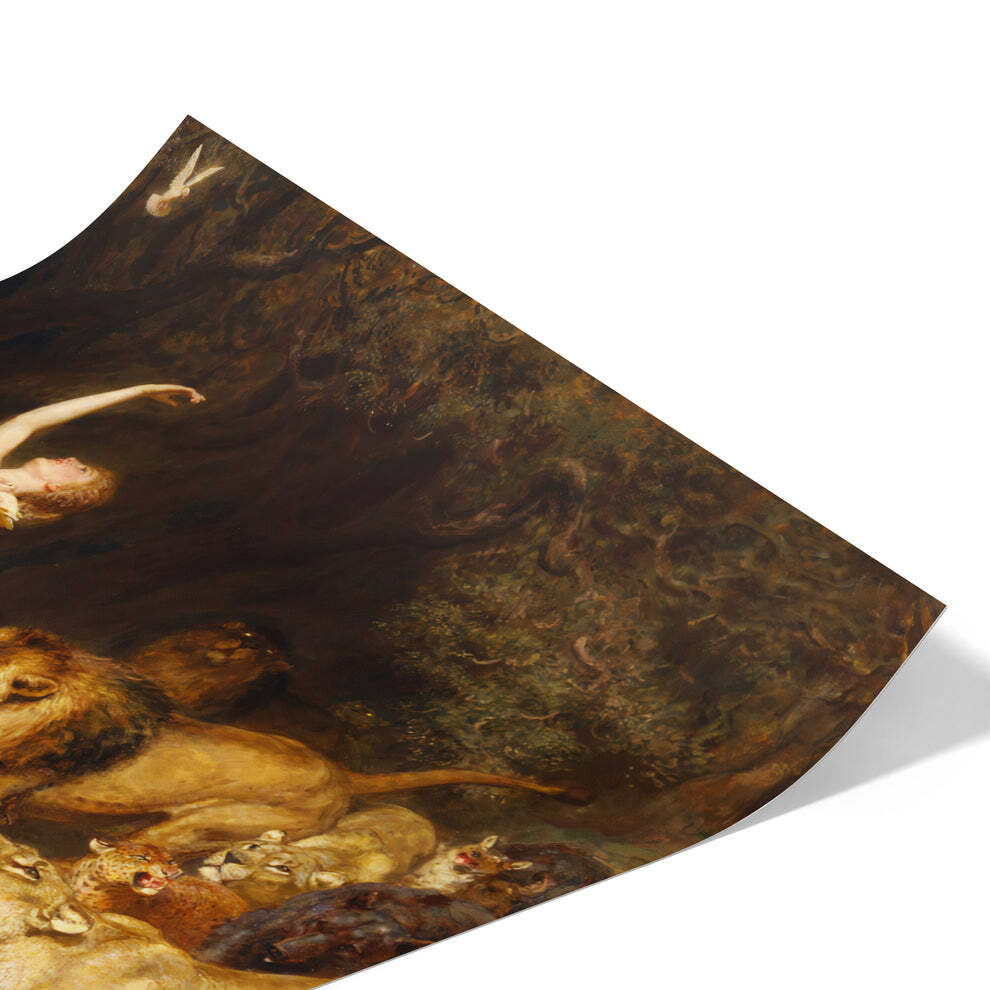 О картине: В этом шедевре 1872 года Ривьер отказывается от драматизма и чудес, выбирая вместо этого момент глубокой неподвижности. Даниил, босой и связанный, стоит спиной к зрителю, с опущенной головой и руками, спокойно скрещёнными за спиной, окружённый прайдом львов, чьи выражения лиц варьируются от любопытства до тихого сдержанности. Львы — написанные с поразительной анатомической точностью — выглядят встревоженными, но подавленными; их сдержанность почти более страшна, чем открытая агрессия. Разбросанные по полу кости напоминают о смертельной природе этого места, и всё же спокойствие Даниила, кажется, властвует в этой сцене.