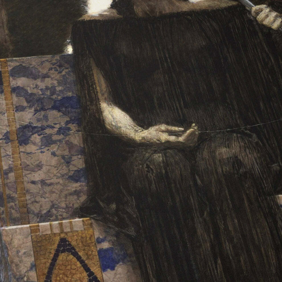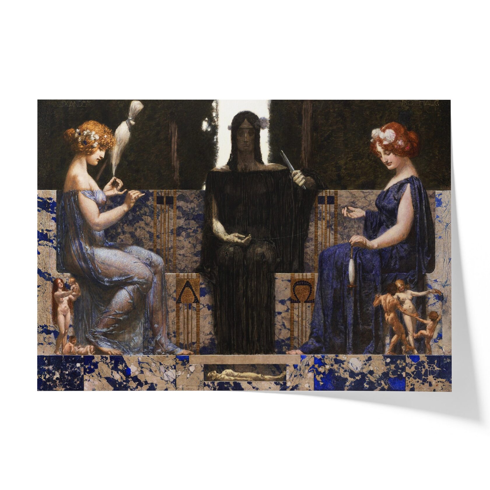 Картина Александра Ротауга «Три Мойры» (1910) превращает древнегреческий миф о мойрах в многослойную аллегорию неизбежности жизни. Атропа, восседающая в центре с почти царственной суровостью, приковывает внимание зрителя, в то время как Клото и Лахесис по обе стороны от неё сохраняют спокойное величие, воплощая циклический путь от рождения к смерти.