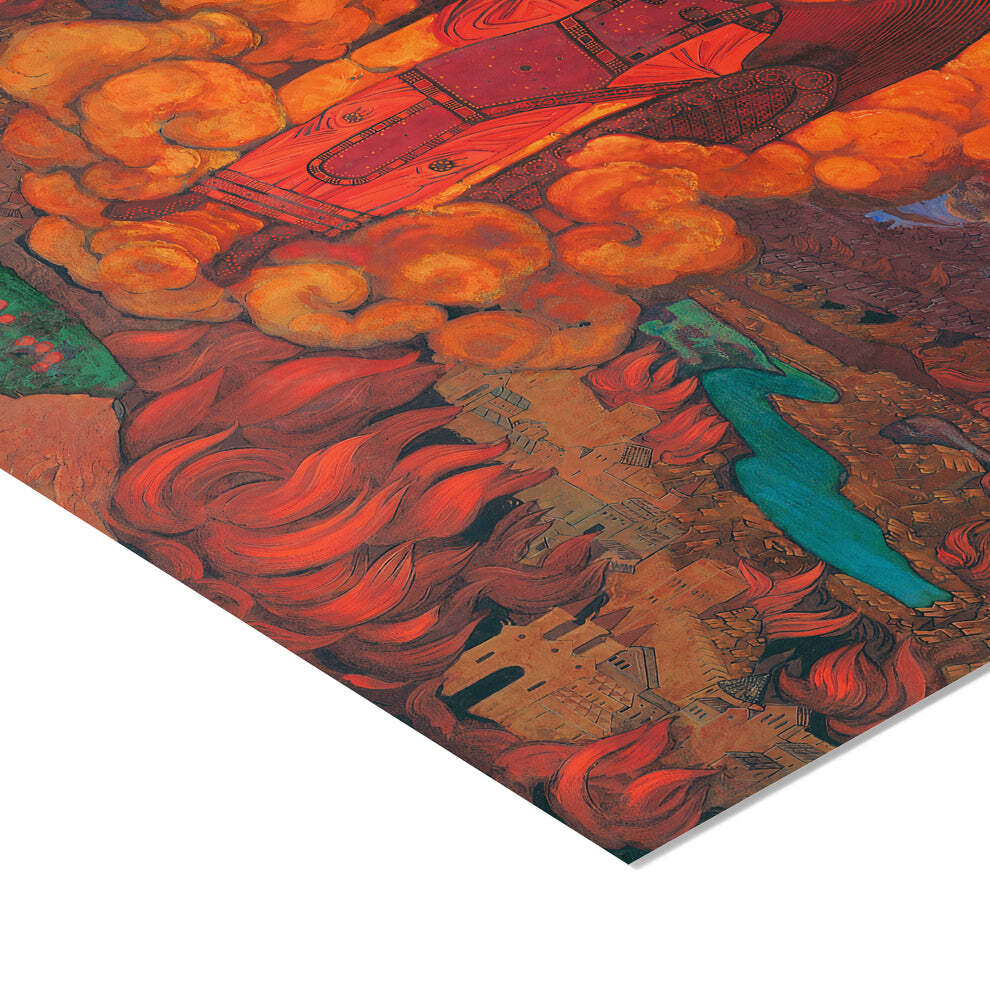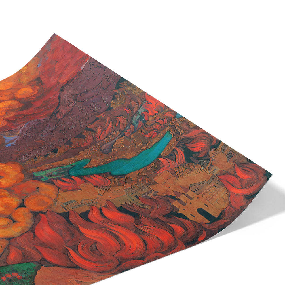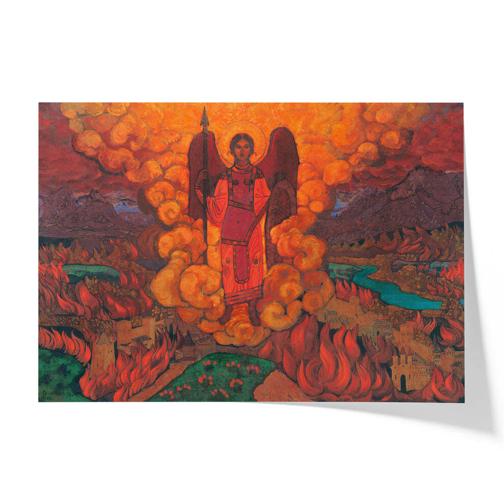 О работе: «Последний ангел» Николая Рериха представляет апокалиптическое видение, где одинокий, торжественно-скорбный ангел стоит среди выжженного, охваченного пламенем пейзажа, воплощая одновременно и суд, и траур.