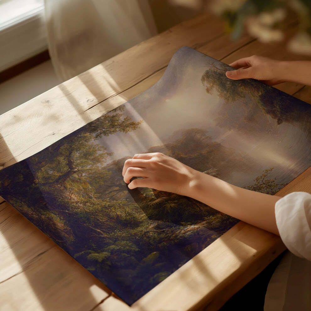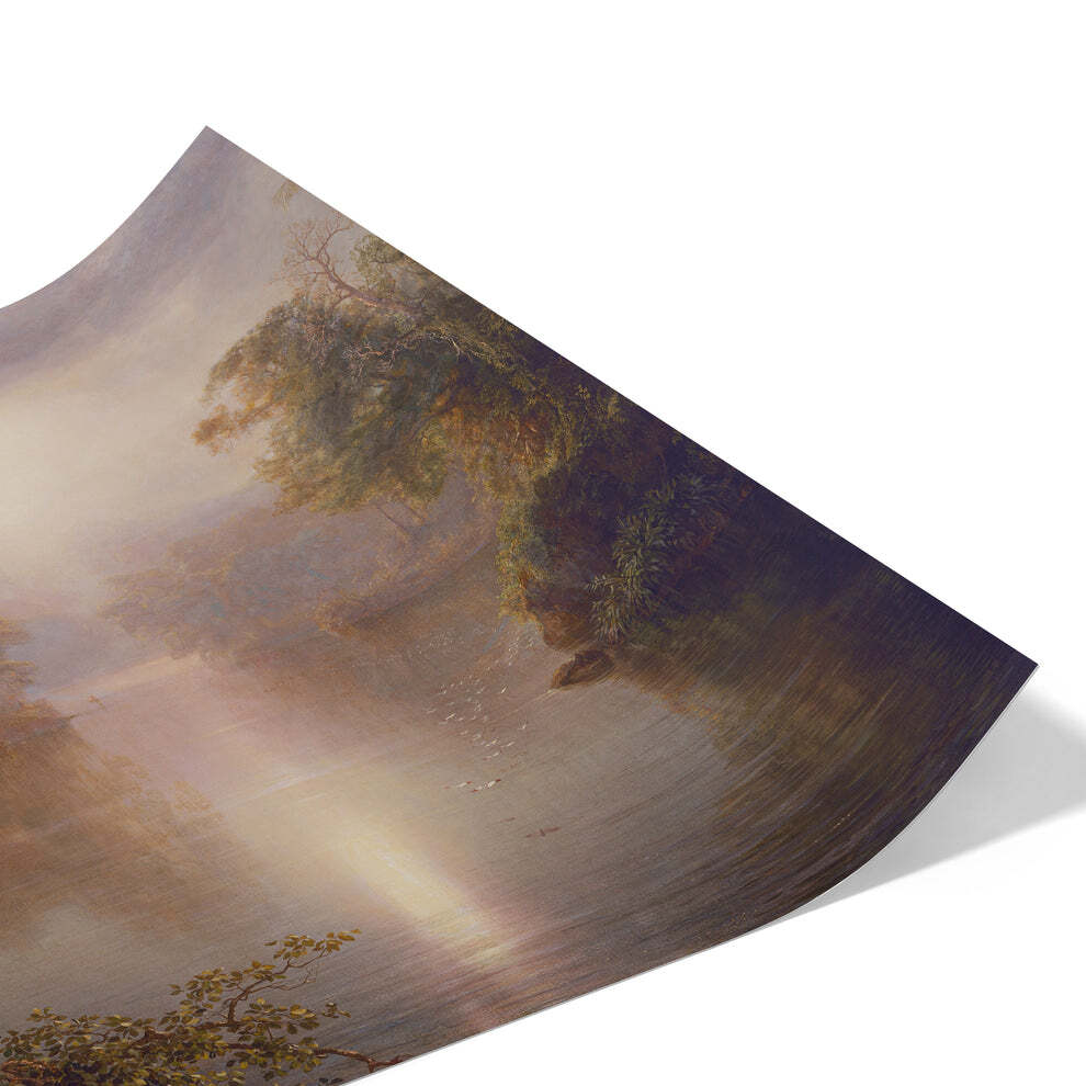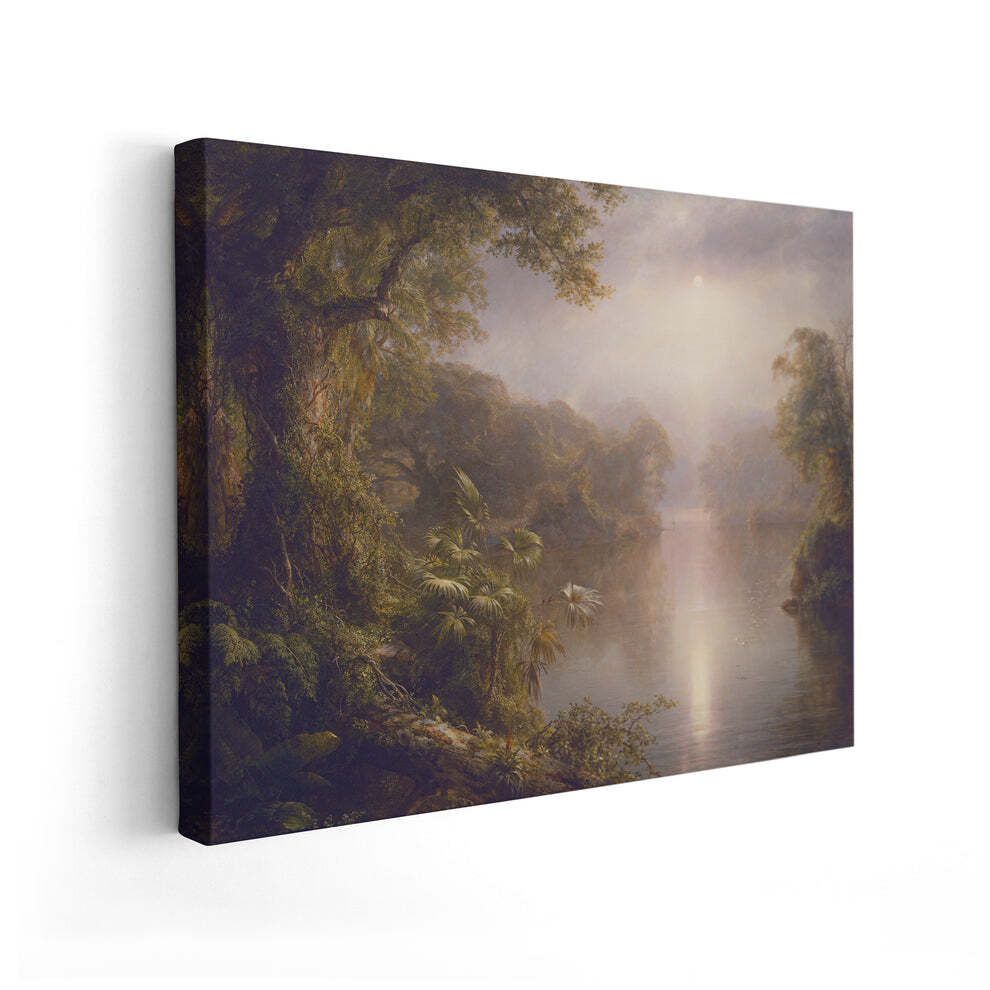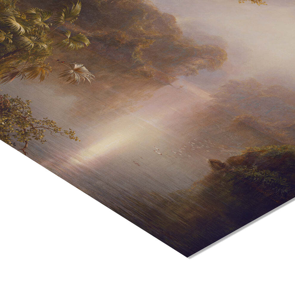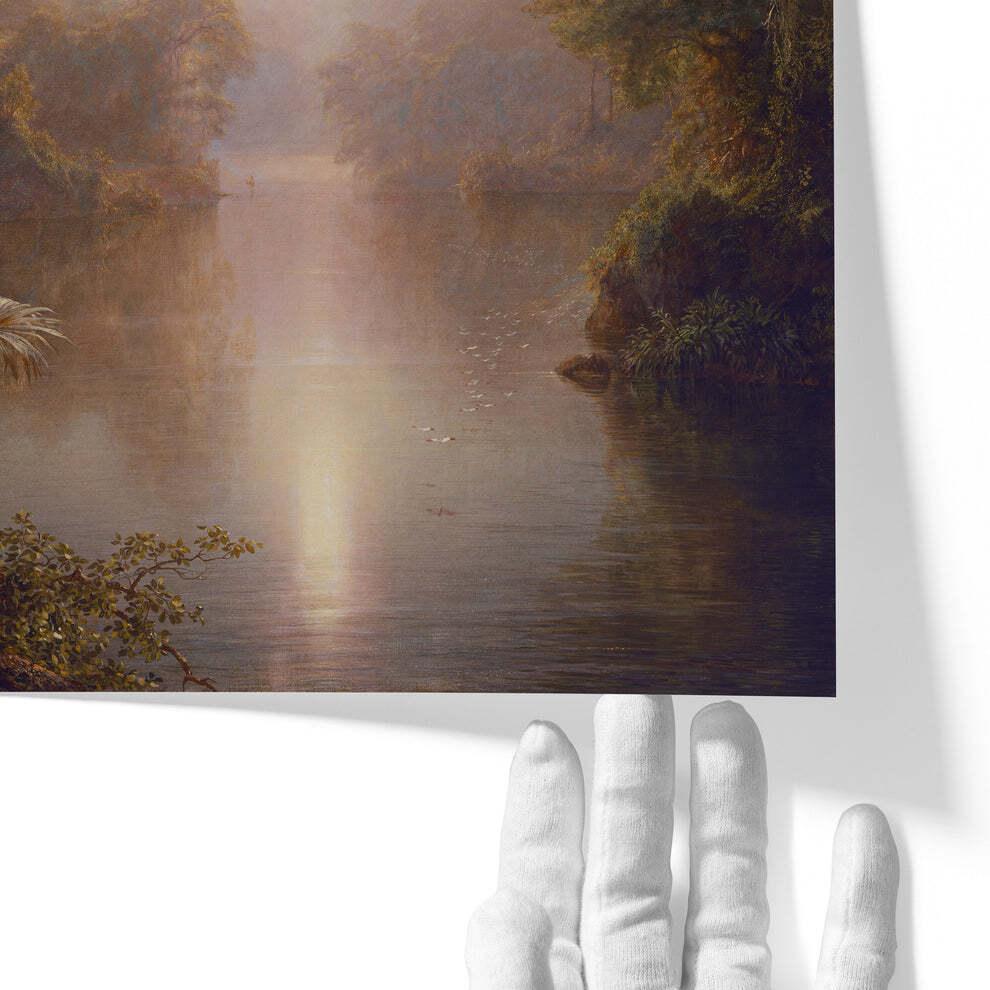 О картине: «Река света» Фредерика Эдвина Чёрча, написанная в 1877 году, — это завораживающее изображение спокойной речной сцены, окутанной мягкими золотыми оттенками сумерек. Мастерское использование света и тени создаёт атмосферу умиротворённости и почти неземной гармонии, когда последние лучи заходящего солнца мягко освещают пейзаж.