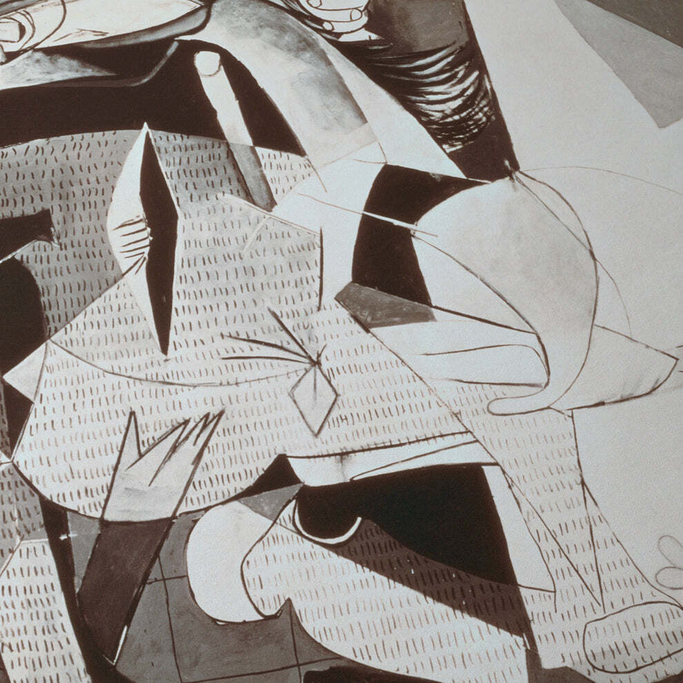 Отсутствие цвета усиливает эмоциональное воздействие, обнажая сцену до ее самой первозданной формы боли. Вместо того чтобы изобразить атаку реалистично, Пикассо прибегает к кубистическому искажению и символизму, чтобы передать универсальную трагедию мирных жертв войны.