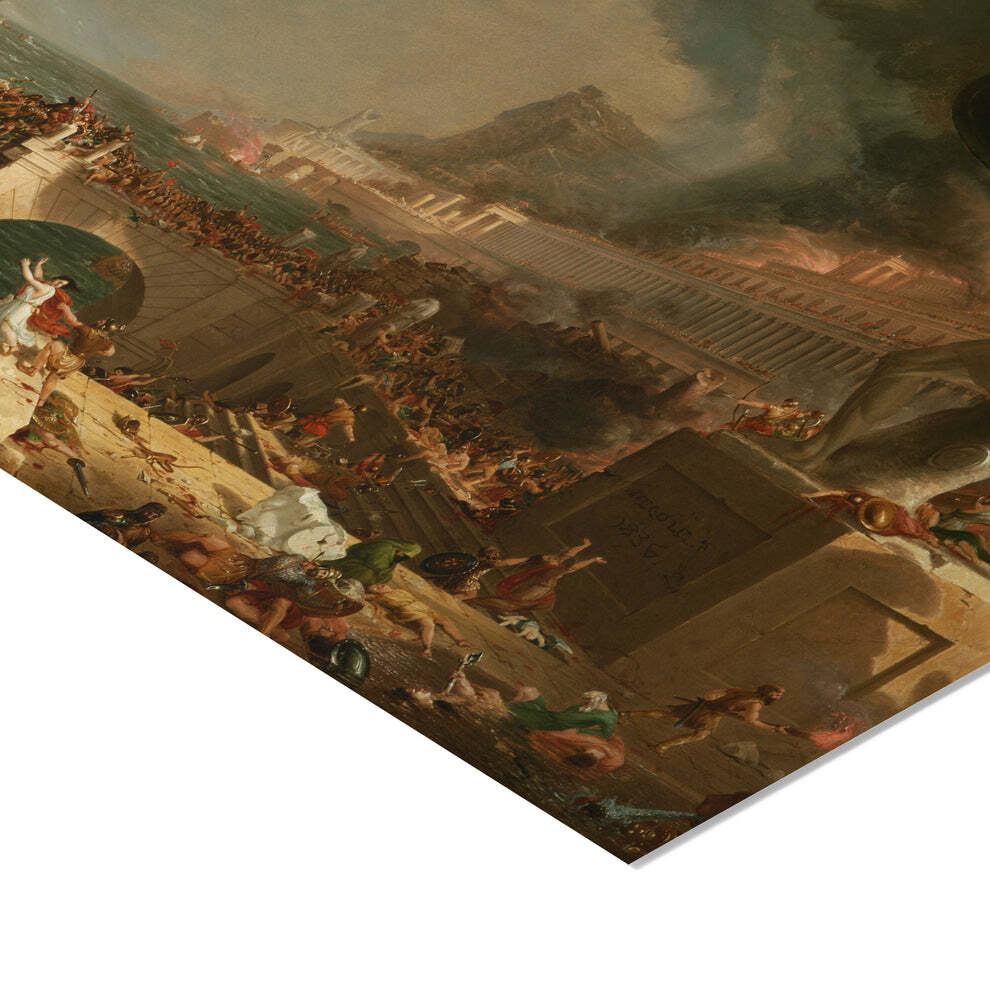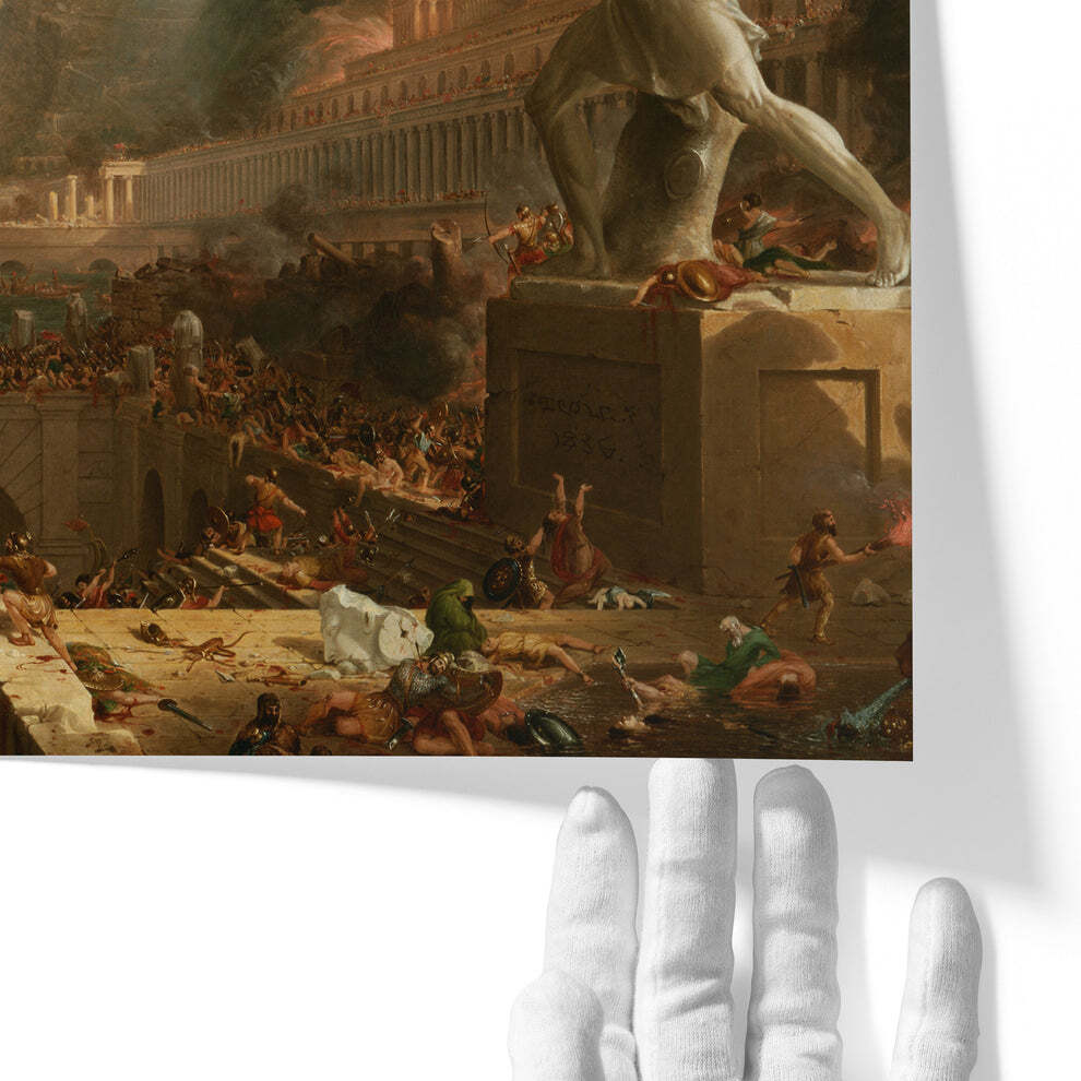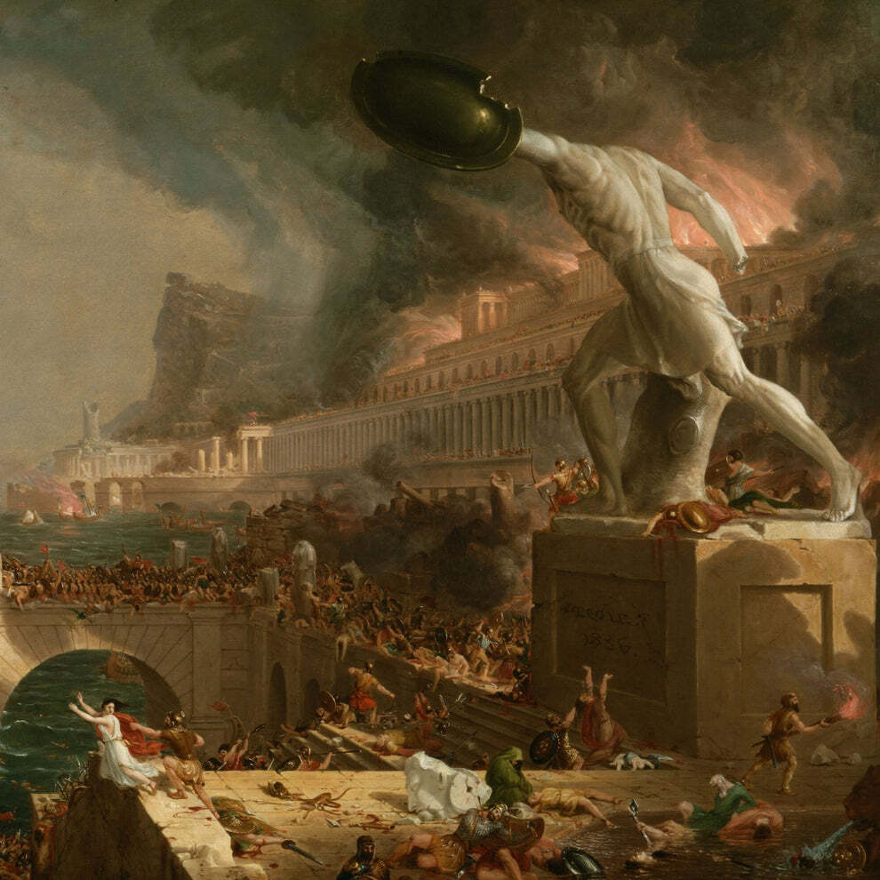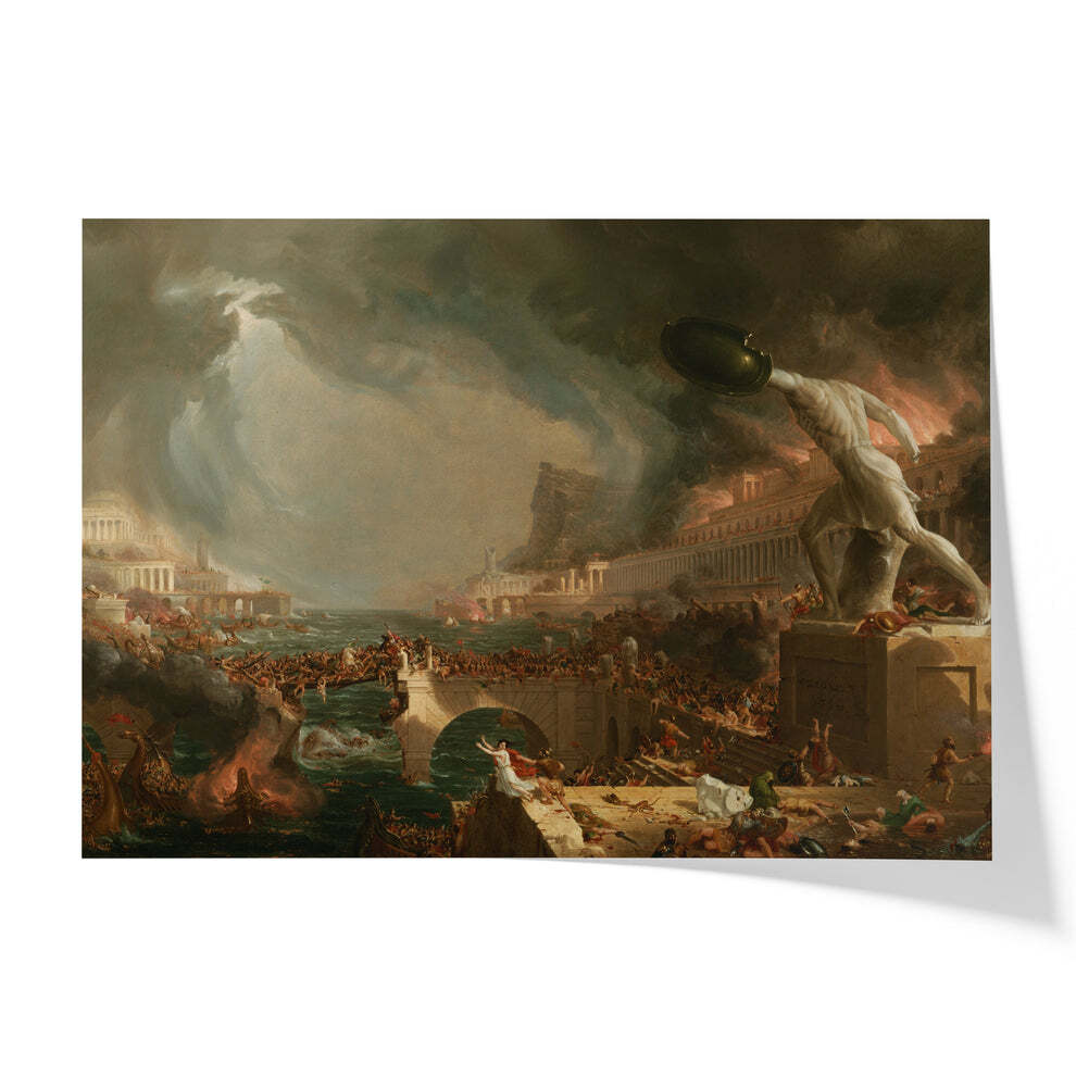 О работе: Картина «Разрушение» входит в знаменитый цикл Томаса Коула The Course of Empire, где художник показывает взлёт и падение воображаемой цивилизации. Эта часть цикла изображает момент крушения — хаос, кровь и насилие, когда некогда величественная империя рушится под собственной тяжестью.