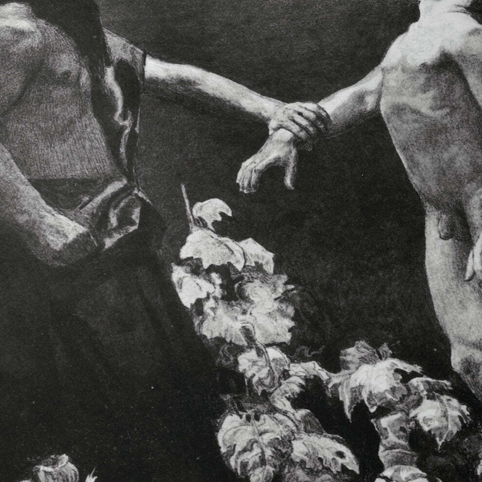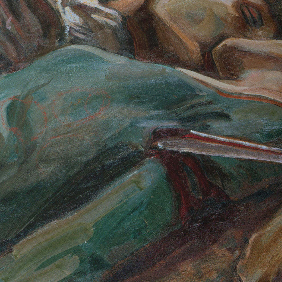 Нижняя часть полотна раскрывает «повествование внутри повествования»: сцены радости, семьи и последнего упокоения, подчеркивающие универсальную власть мойр.