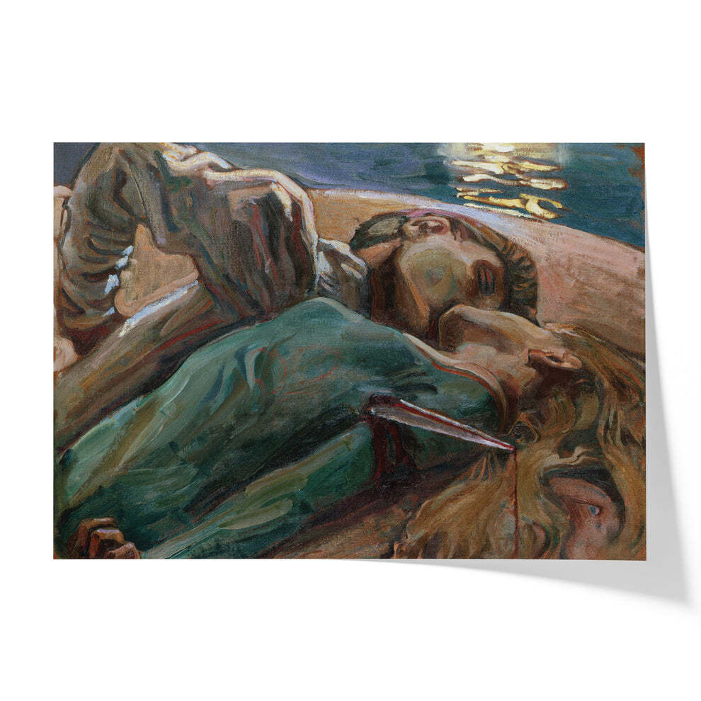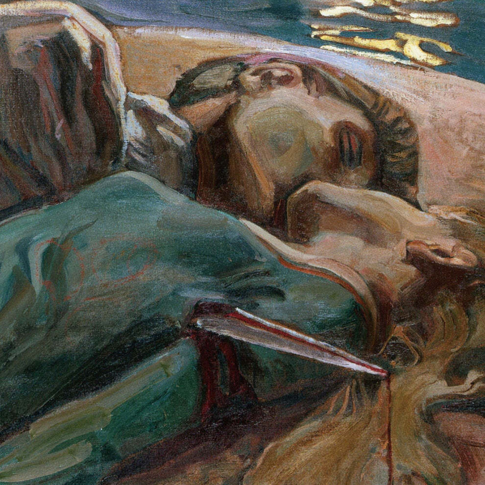 О картине: Картина Аксели Галлен-Каллелы Влюблённые (1906–1917) изображает двух фигур, заключённых в объятие, которое одновременно и нежное, и тревожное, нарушаемое присутствием меча между их телами. Контраст между интимностью и опасностью превращает картину во что-то большее, чем просто изображение страсти — она становится размышлением о двойственной природе любви, которая и даёт жизнь, и разрушает. Созданная в период, когда Галлен-Каллела отходил от своих героических сцен по «Калевале» к более личным и психологическим темам, работа отражает идеалы символизма, используя меч как мощный метафорический образ жертвы, предательства или неизбежности утраты. Она показывает любовь не как чистую гармонию, а как силу, затенённую хрупкостью и смертностью.