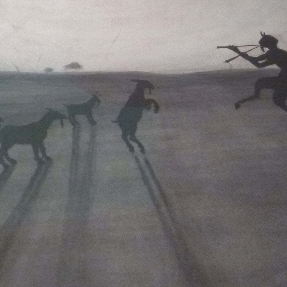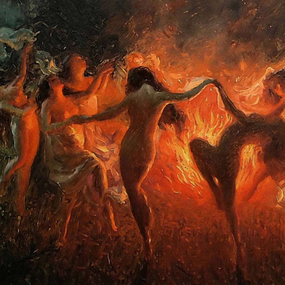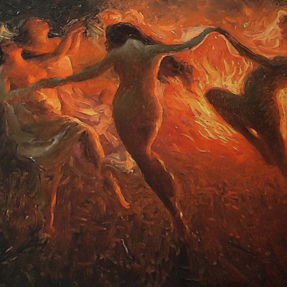 Нимфы, олицетворяющие природную красоту и свободу, в безудержном танце кружатся вокруг огня — символа преобразования и желания. На краю сцены Пан играет на своей флейте — инструменте, связанном с инстинктом и плодородием, — направляя обряд невидимым, но мощно ощущаемым ритмом.