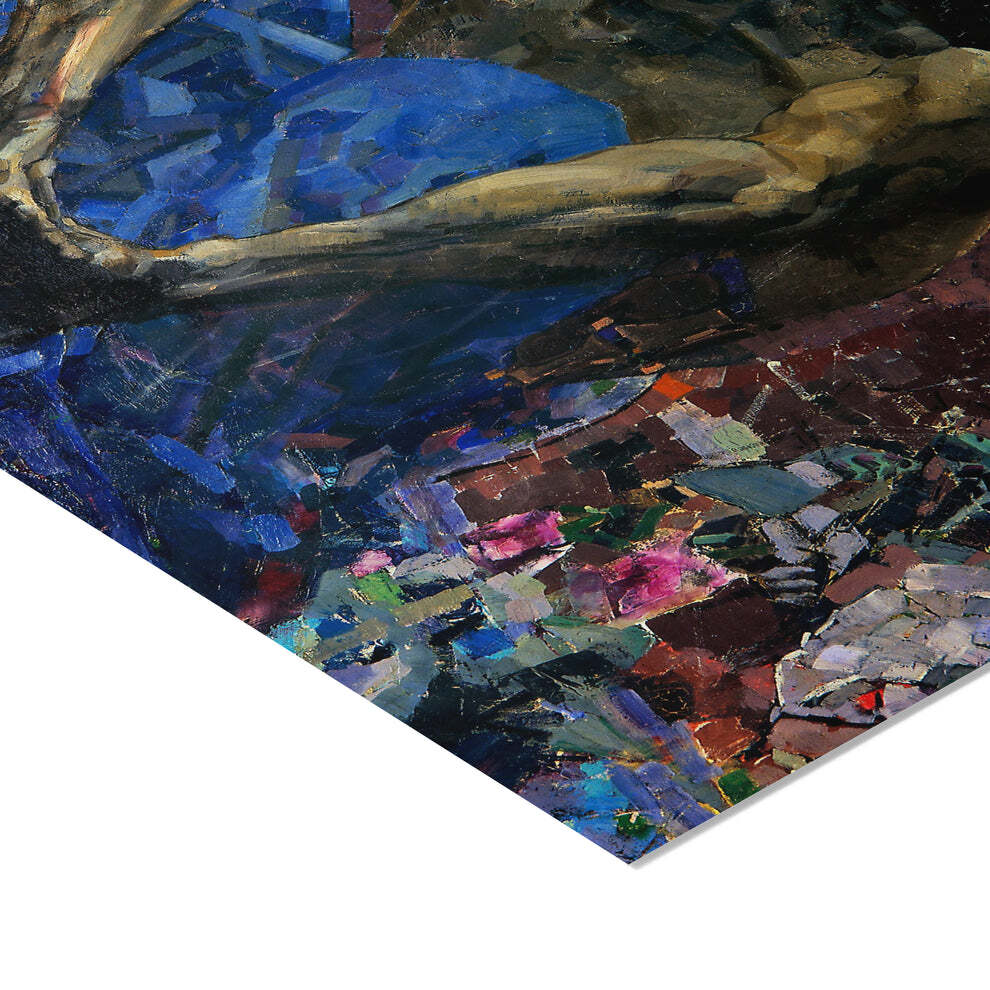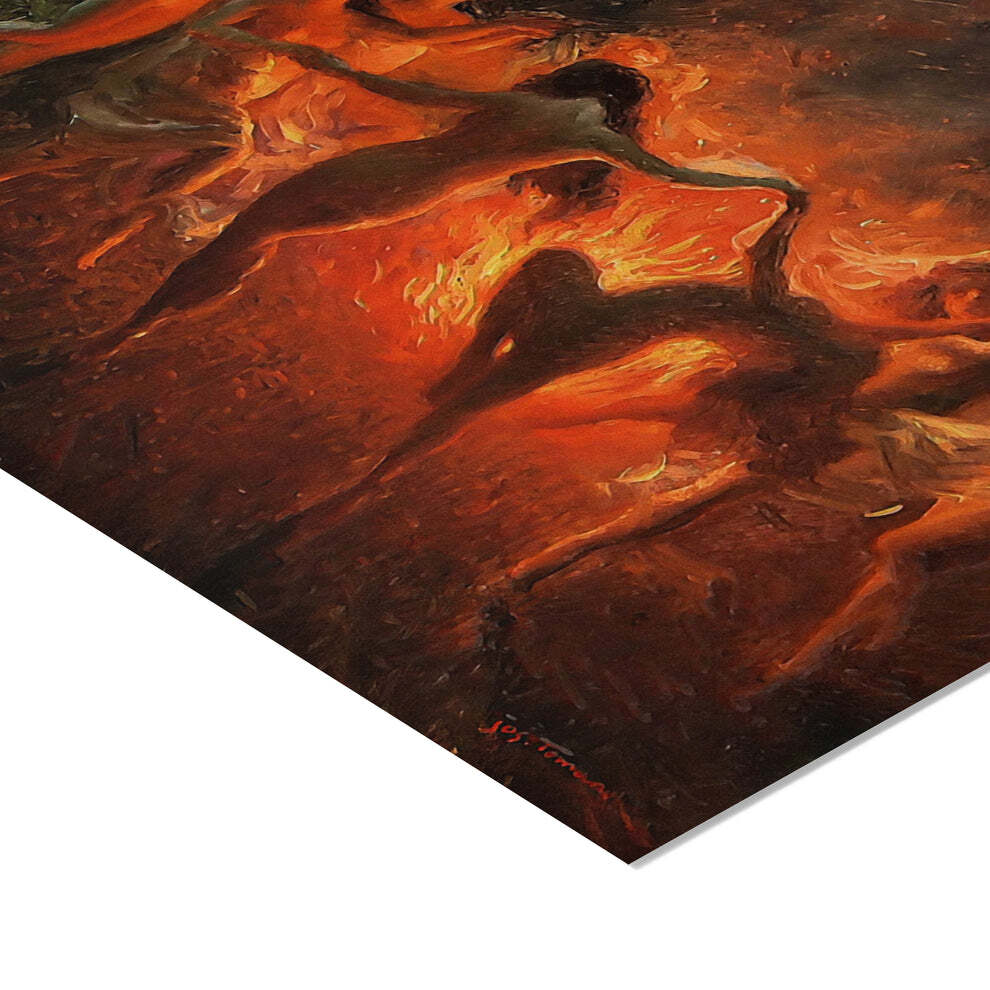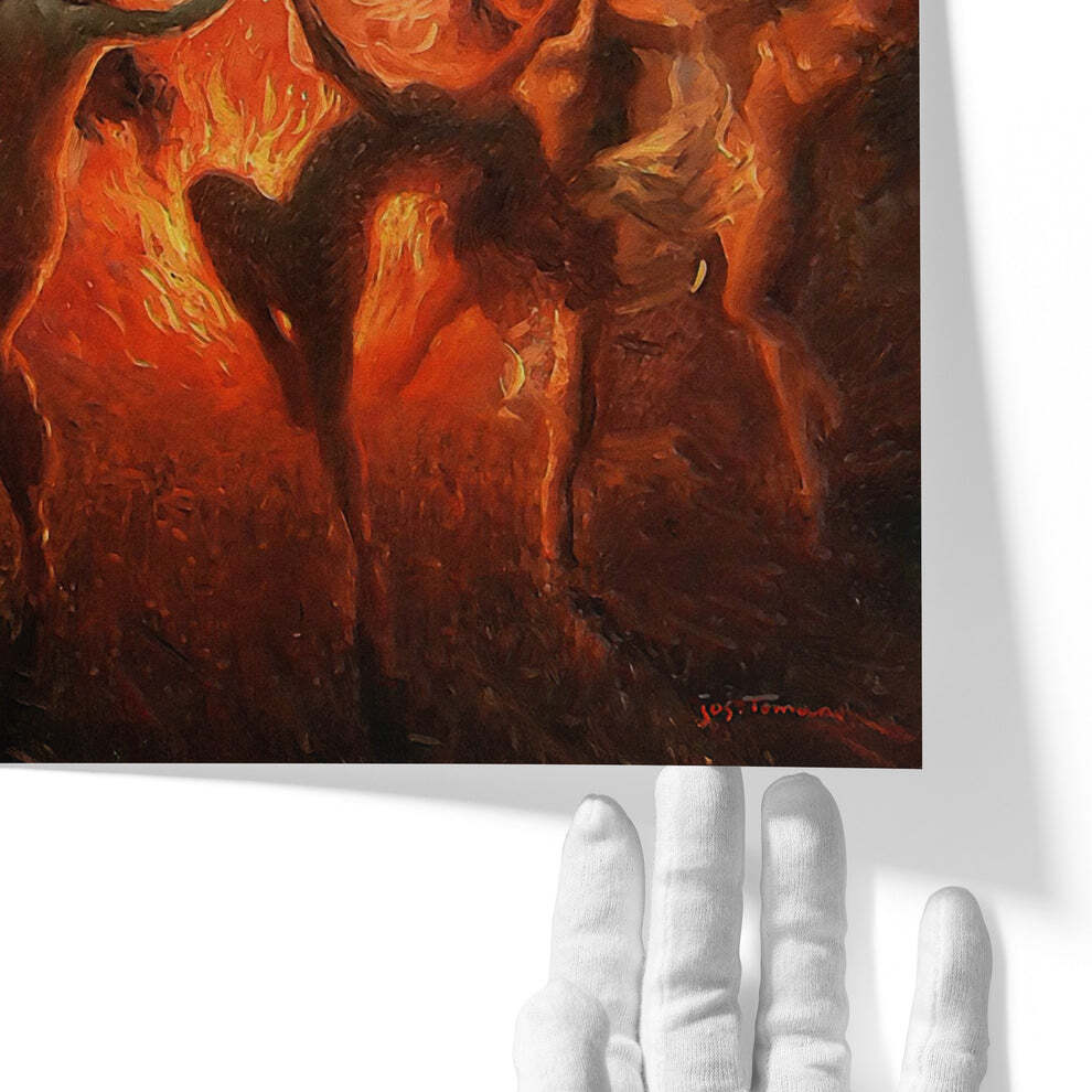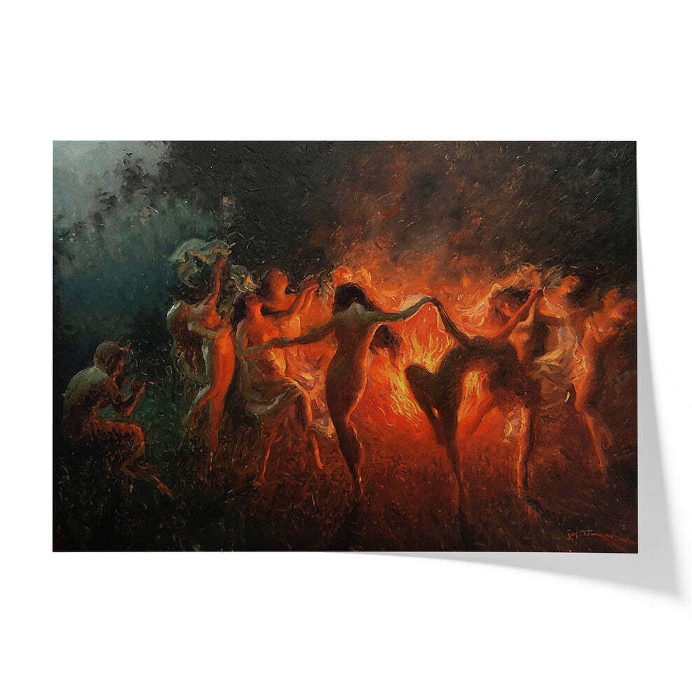 Игра света и теней в отблесках костра усиливает сновидческую атмосферу картины, превращая момент в выражение экстатического единения между человеческим телом, миром природы и божественным началом.