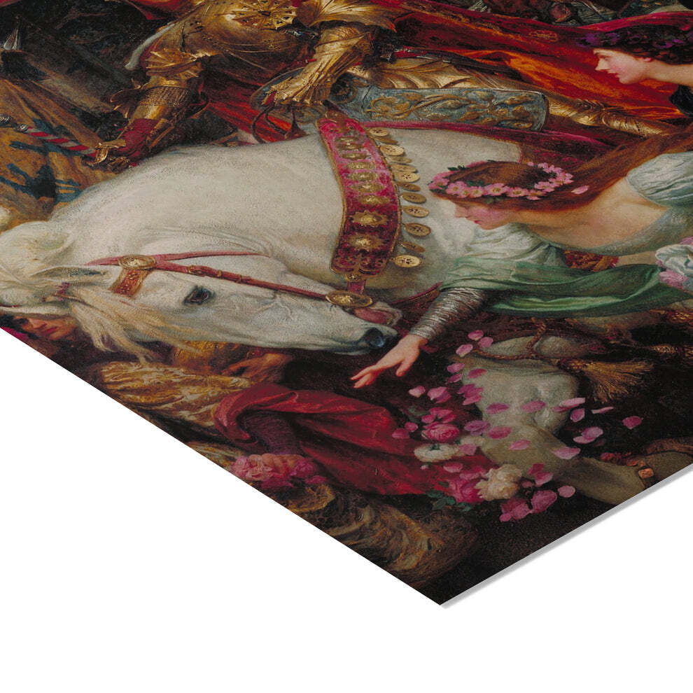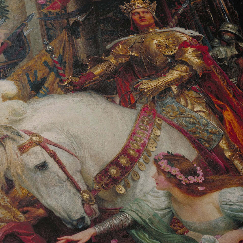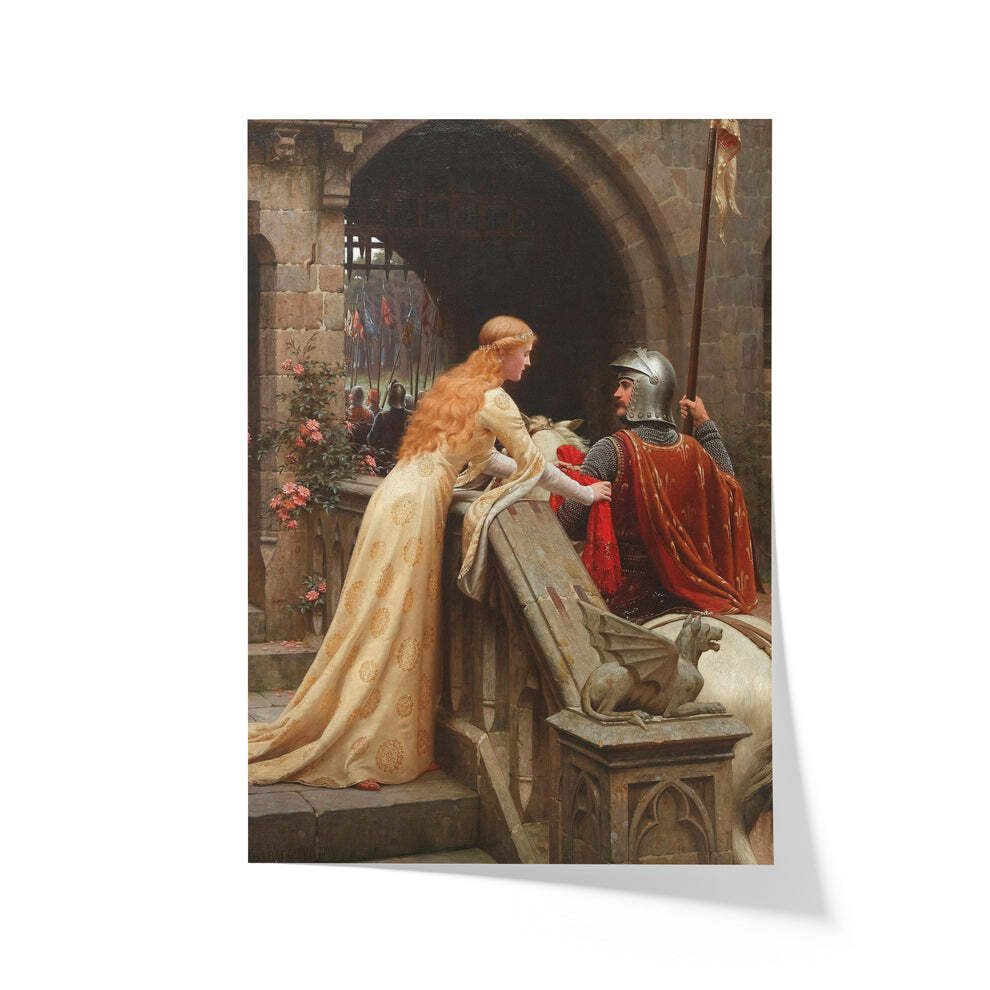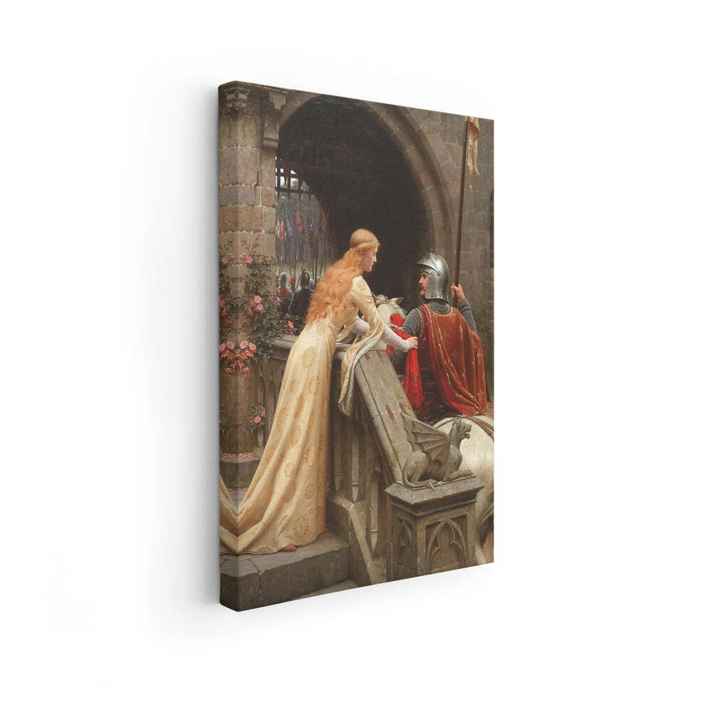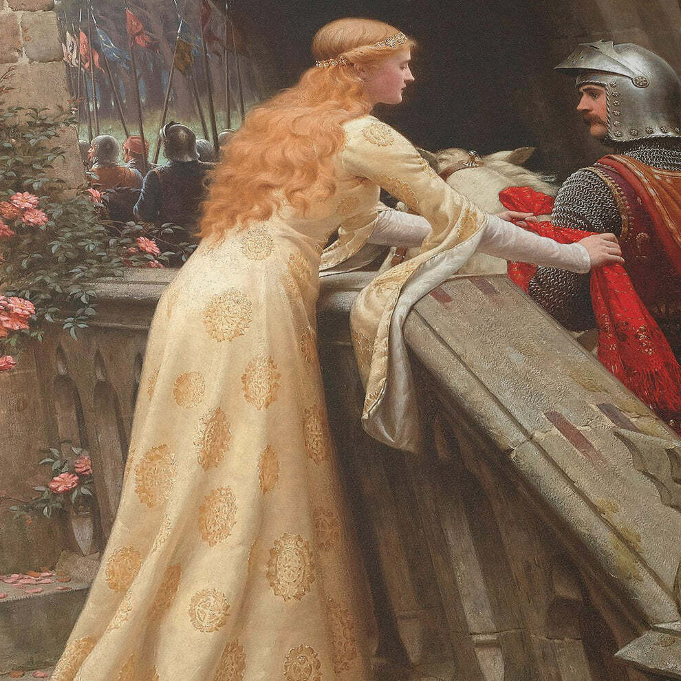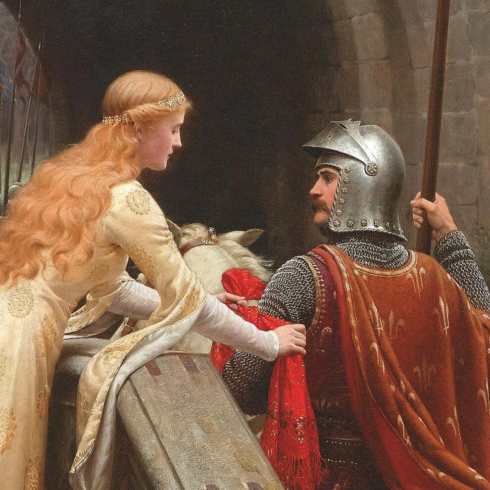 Картина Эдмунда Блэра Лейтона «С Богом» (1900) передаёт трогательную сцену средневекового прощания: дева повязывает красный пояс на руку рыцаря в доспехах перед его уходом на битву. Этот жест становится одновременно знаком любви и символом надежды на благополучное возвращение, соединяя романтику с торжественными традициями рыцарства.