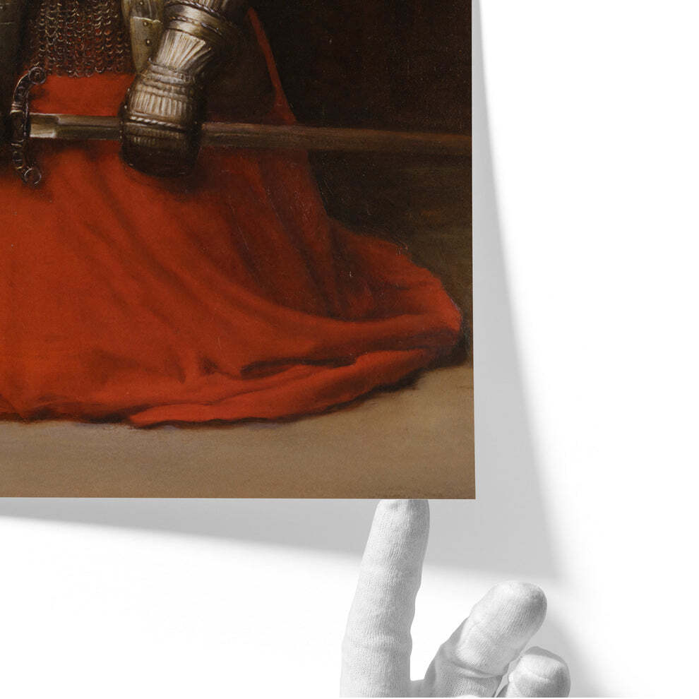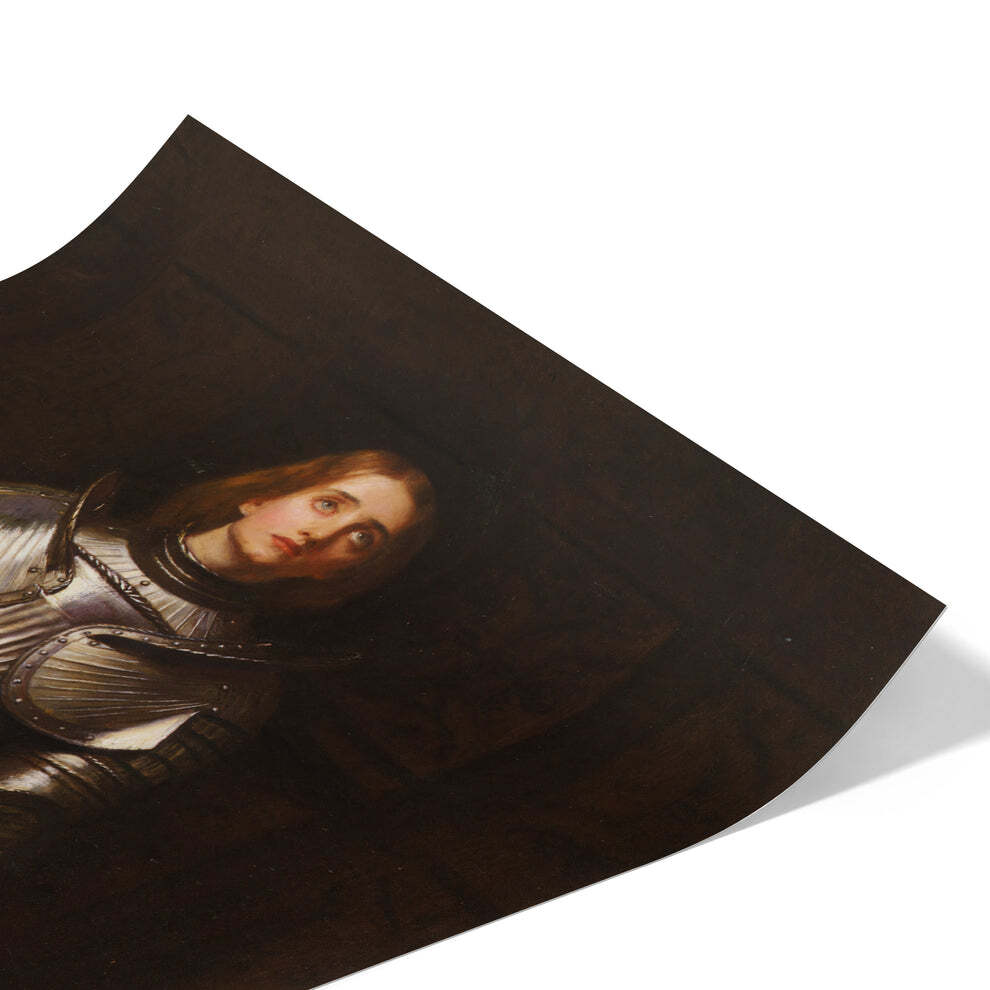 Стоя на коленях в части доспехов, с мечом в руке и снятым шлемом, Жанна поднимает взгляд к небу, соединяя преданность и решимость — это мгновение, когда она принимает своё божественное предназначение.