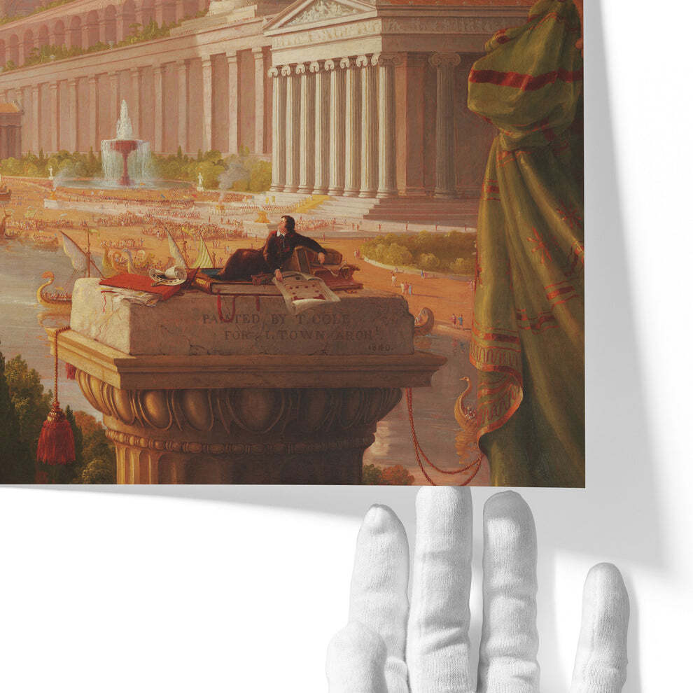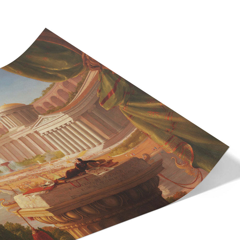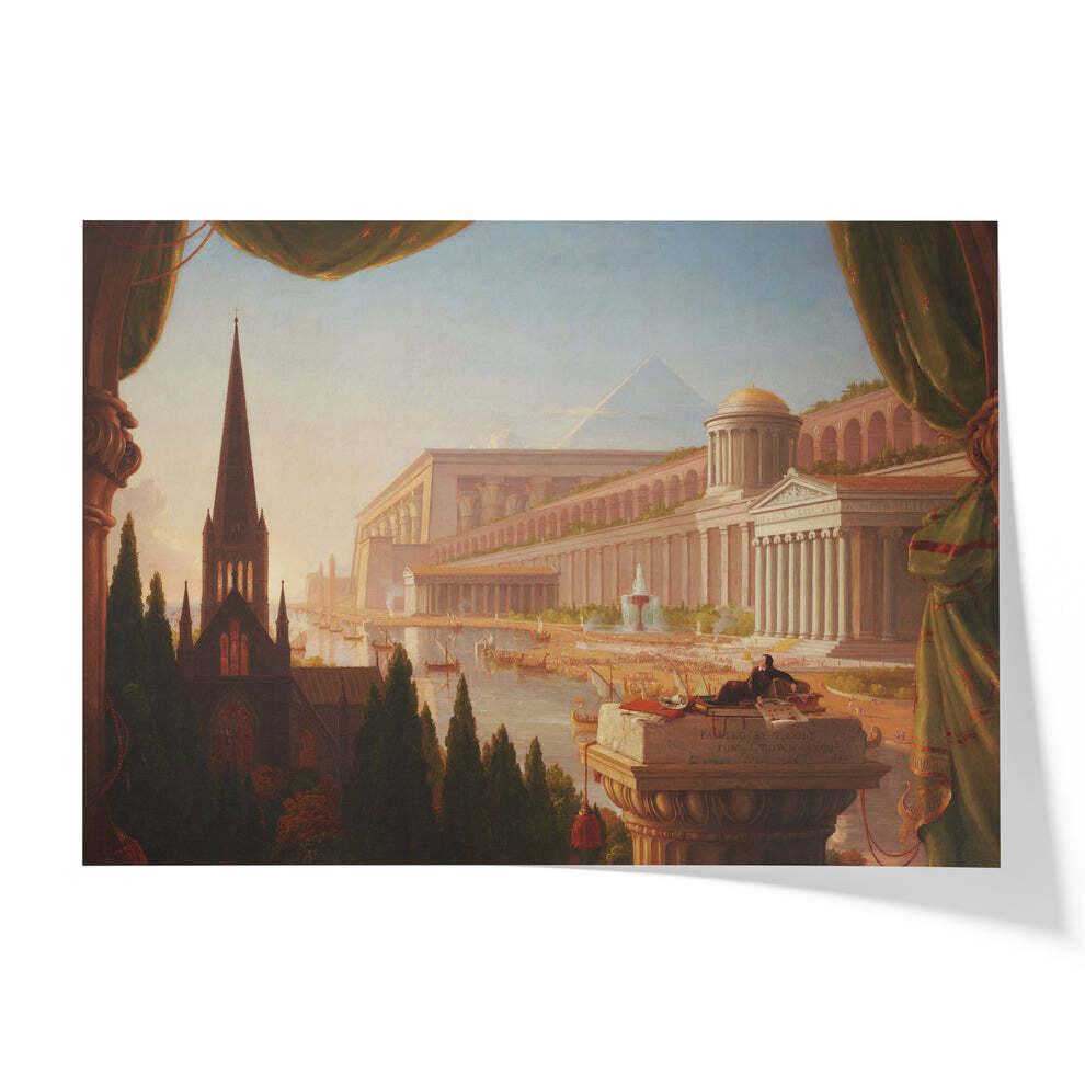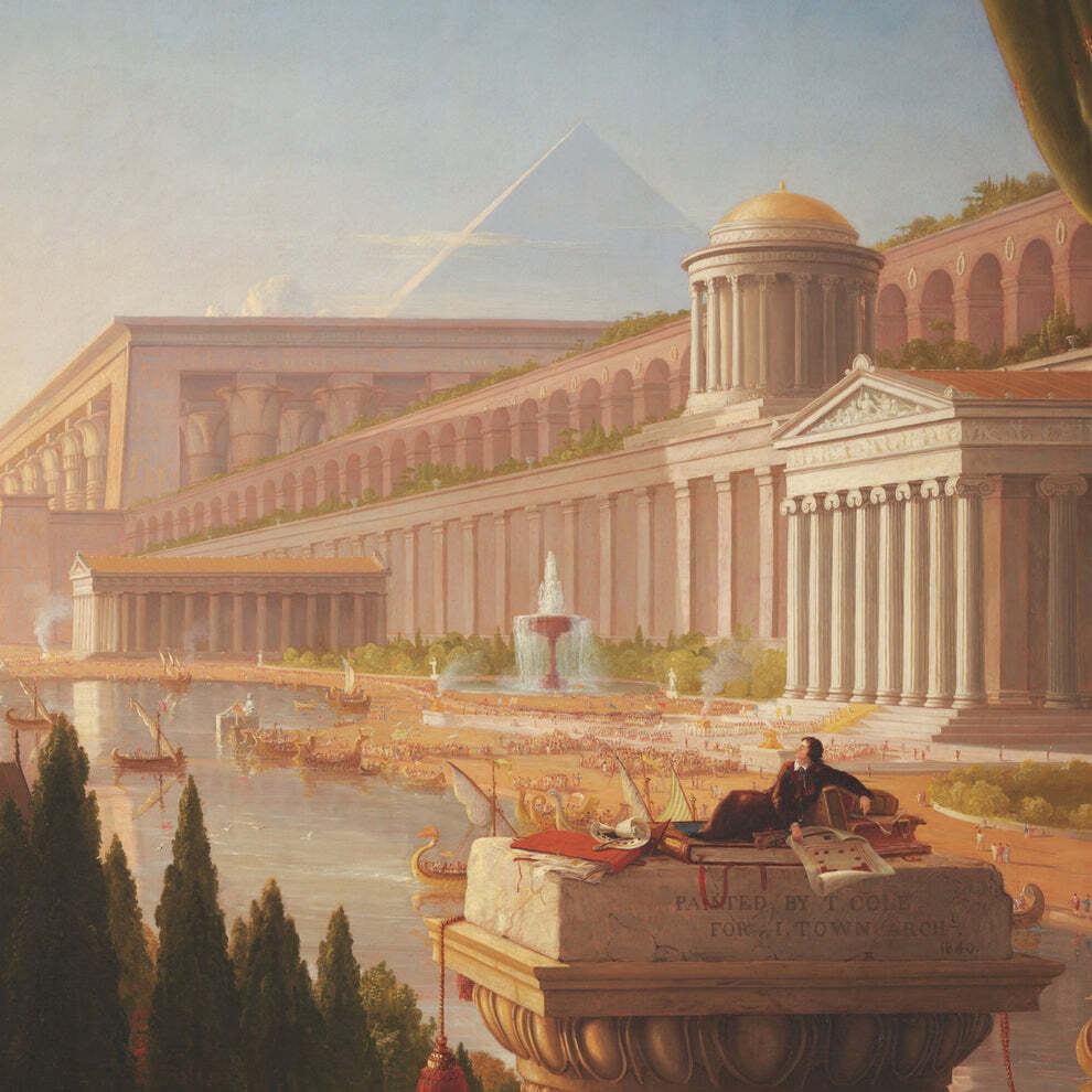 О работе: Картина Томаса Коула «Мечта архитектора» (1840) — это широкая аллегория истории архитектуры, представляющая в одной сновидческой панораме достижения Египта, Греции, Рима и готического Средневековья. Объединяя эти стили в единый воображаемый пейзаж, Коул не только демонстрирует своё увлечение эволюцией культуры, но и возвышает архитектуру как символ человеческого творчества и духовного устремления.