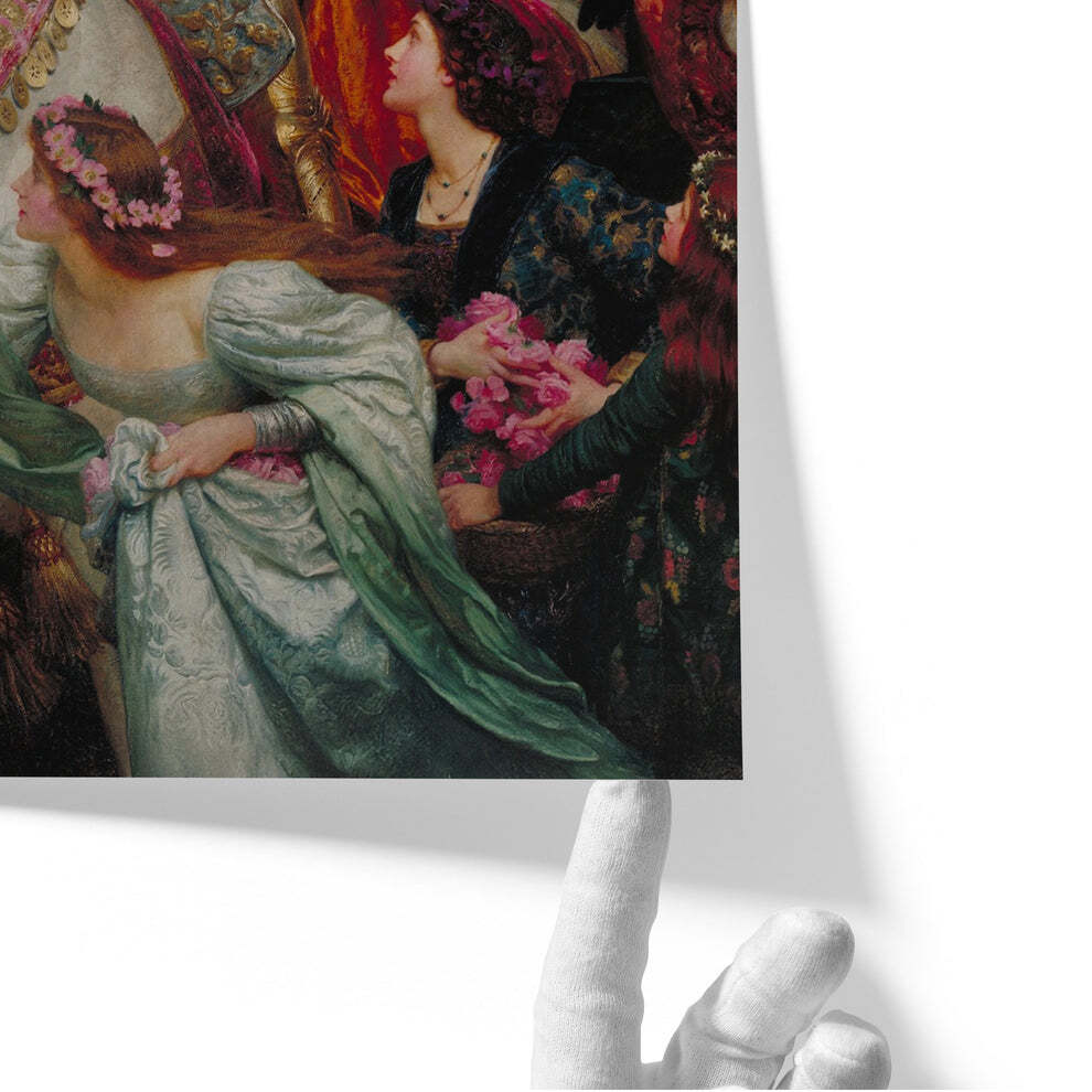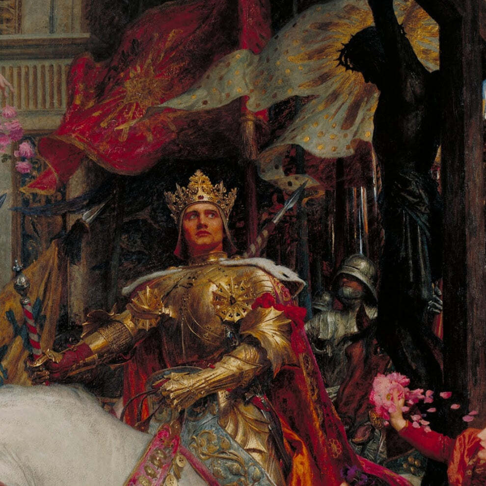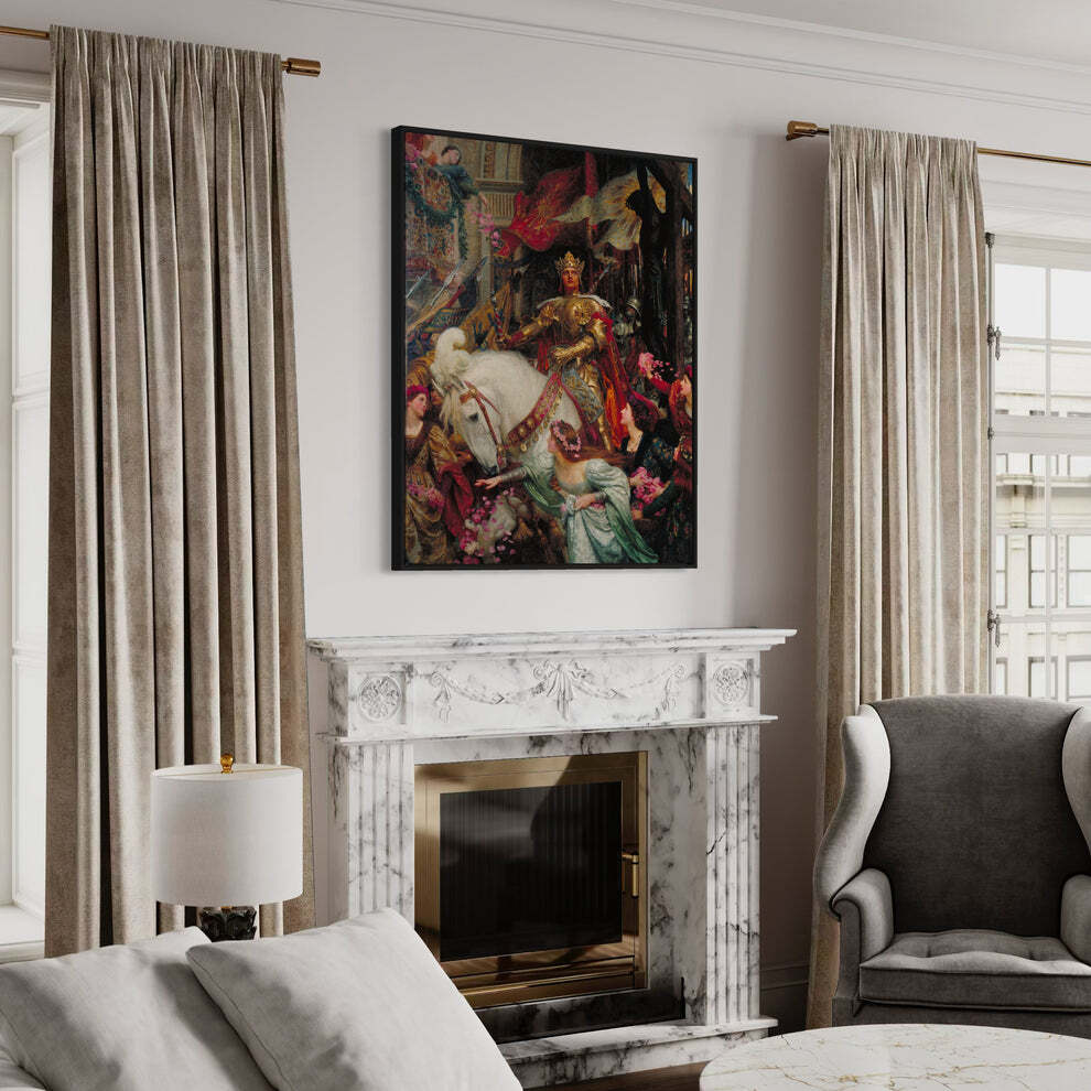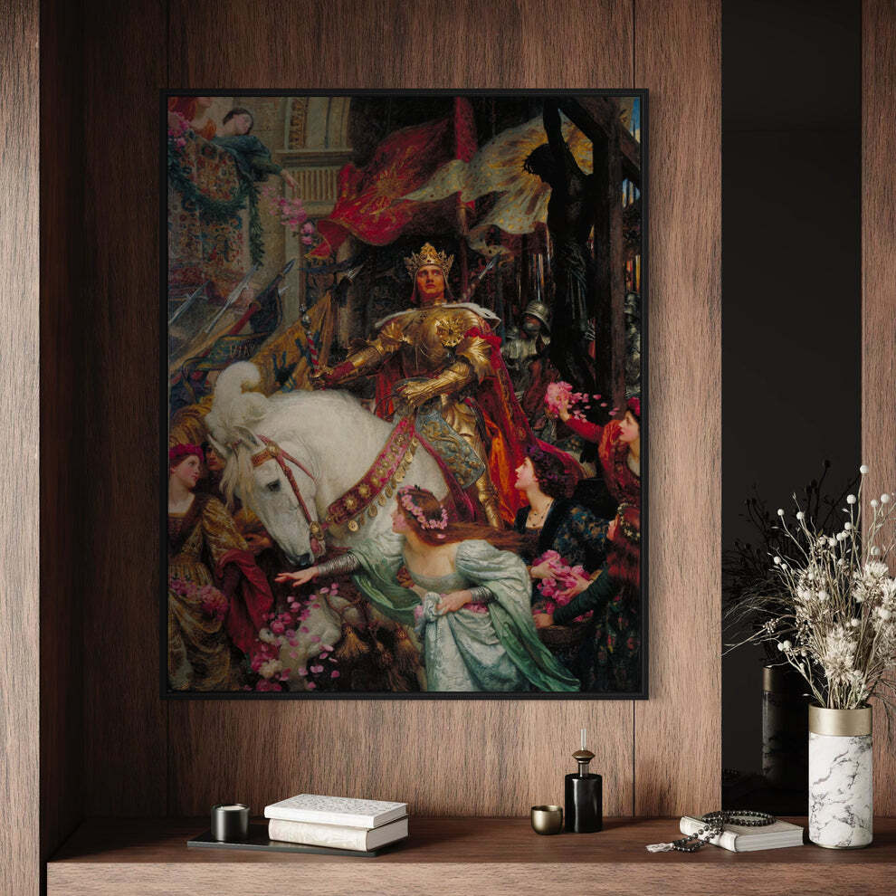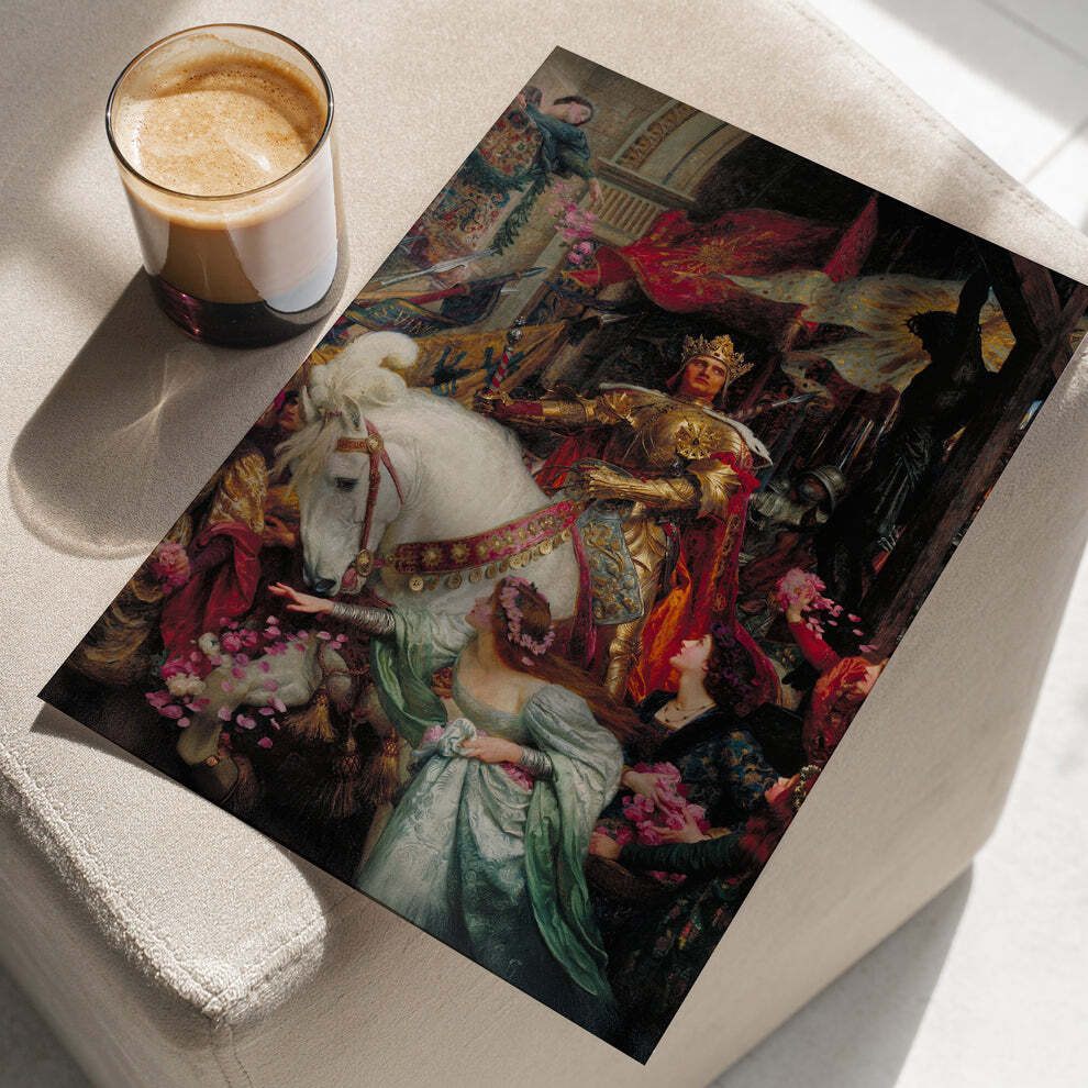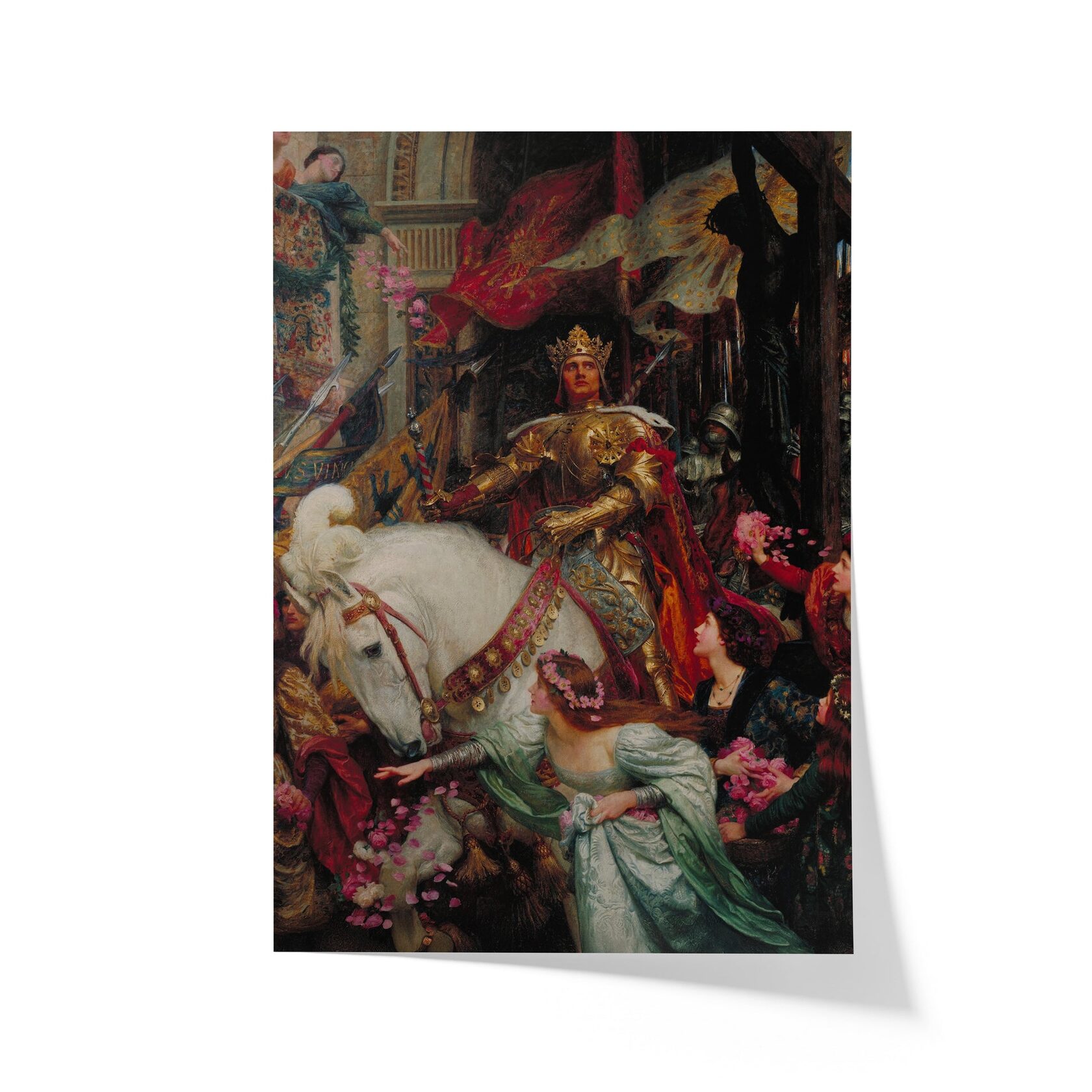 О работе: Эта картина изображает торжественного средневекового принца, возвращающегося домой на белом коне, украшенном тремя перьями — символом знатности. На нём золотая корона и роскошные доспехи, вокруг ликующая толпа, осыпающая его лепестками в честь победного возвращения.