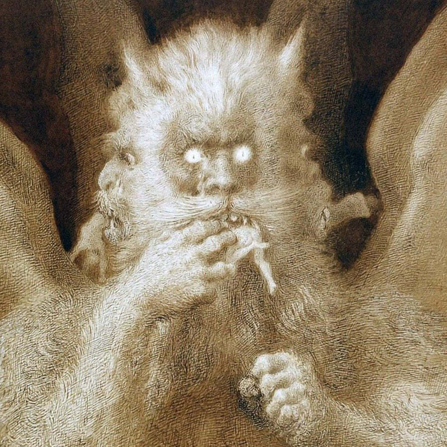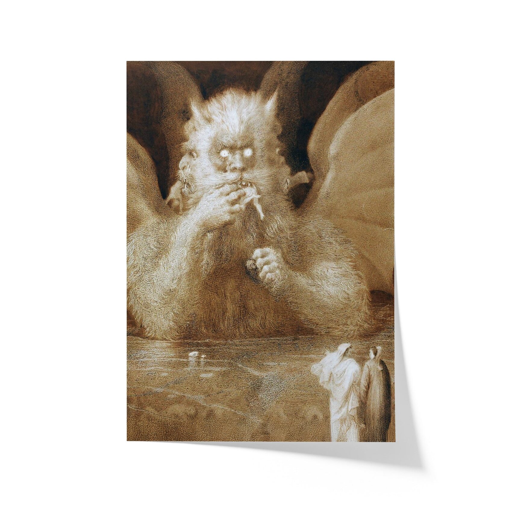 О работе: Созданная как часть масштабной серии иллюстраций к «Божественной комедии» Данте, работа показывает падшего ангела в облике чудовищного трёхглавого зверя, пожирающего Иуду, Брута и Кассия в ледяных глубинах ада.