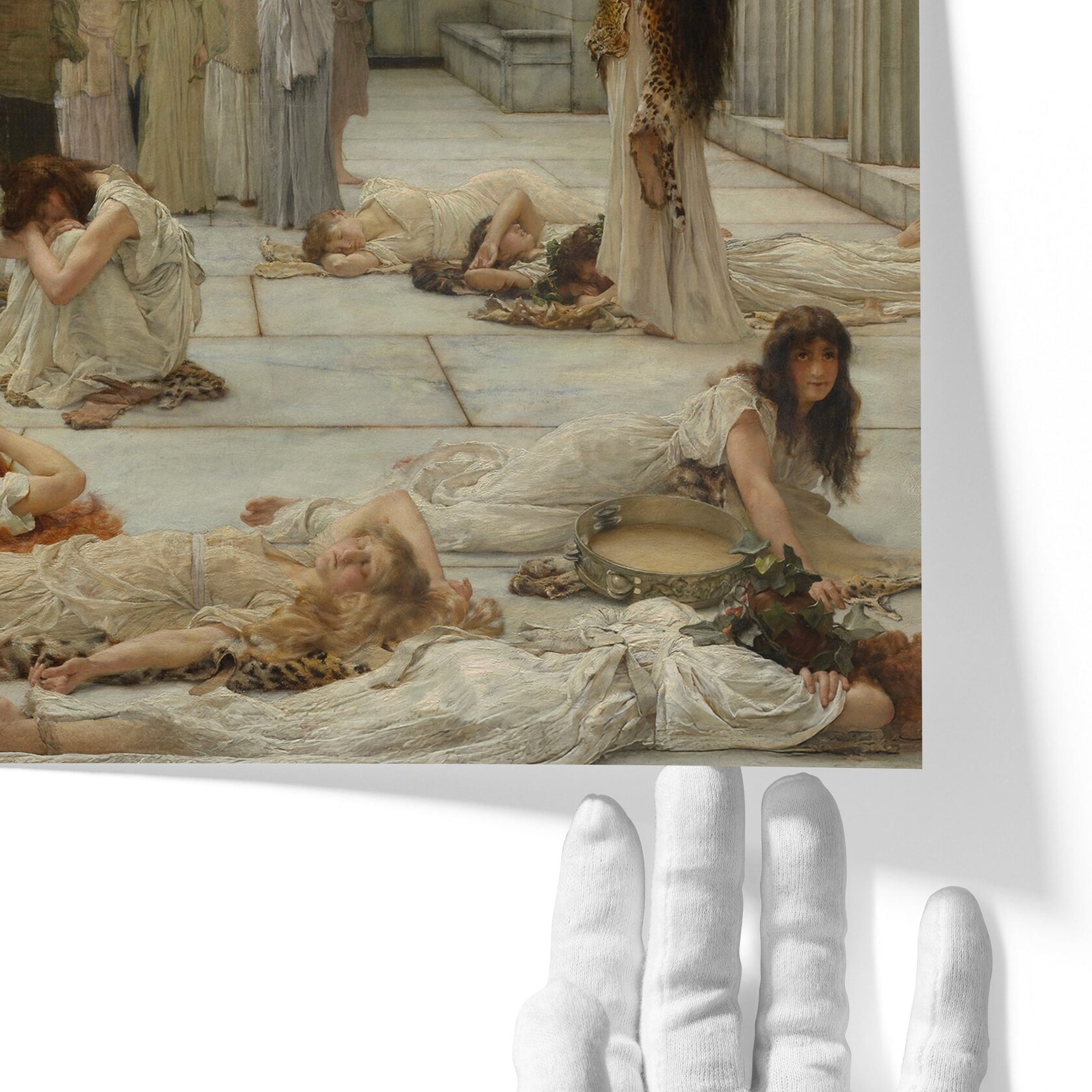 Контраст между измождёнными, уязвимыми телами менад и спокойной заботливостью женщин Амфиссы подчёркивает темы сострадания и женской солидарности, выходящие за рамки социальных или религиозных различий. Вместо того чтобы драматизировать хаос, Альма-Тадема превращает эпизод из греческой истории в сцену тихого гуманизма, отражающую его викторианский интерес к античности не как к далёкому мифу, а как к миру, полному узнаваемых и глубоко человеческих переживаний.