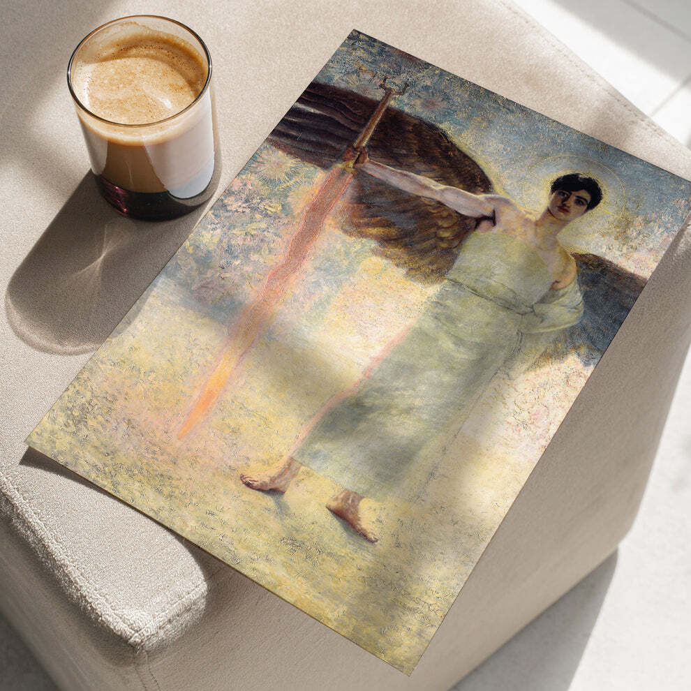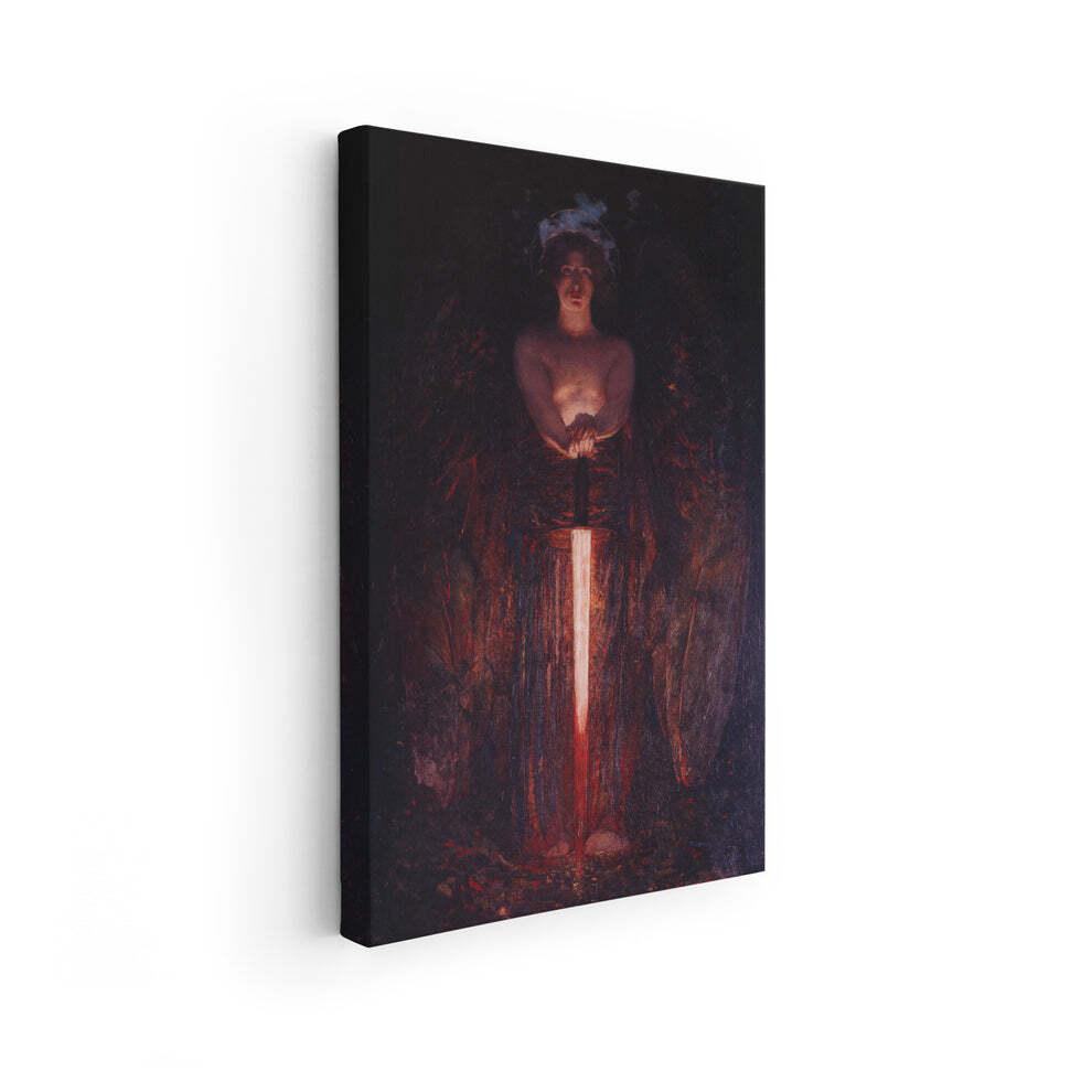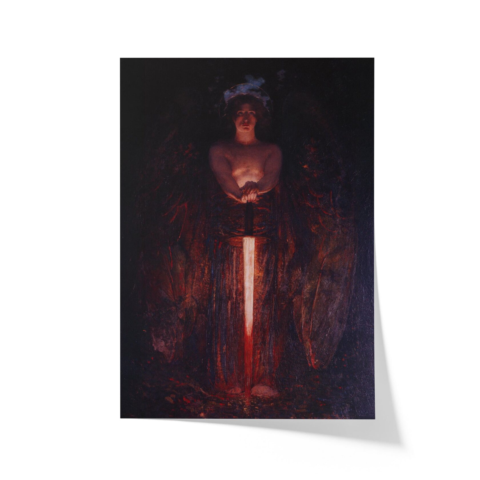 О работе: Картина Эдвина Хоуленда Блэшфилда «Ангел с огненным мечом» (1893) изображает библейского стража Эдема с величественной торжественностью, представляя его одновременно и величественным, и страшным. Стоя прямо с невозмутимым взглядом, ангел держит пылающий меч, освещающий всё полотно и превращающий оружие в символ божественной справедливости и вечного изгнания из рая.