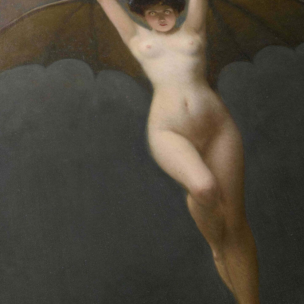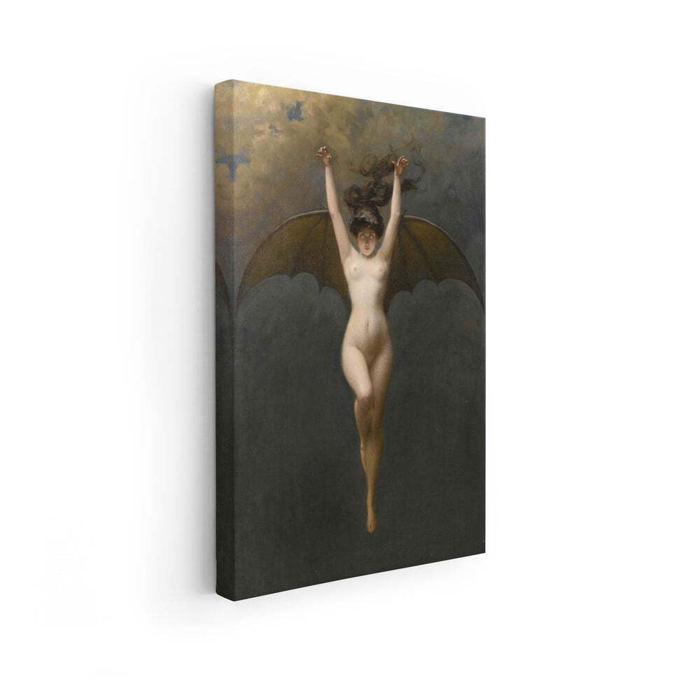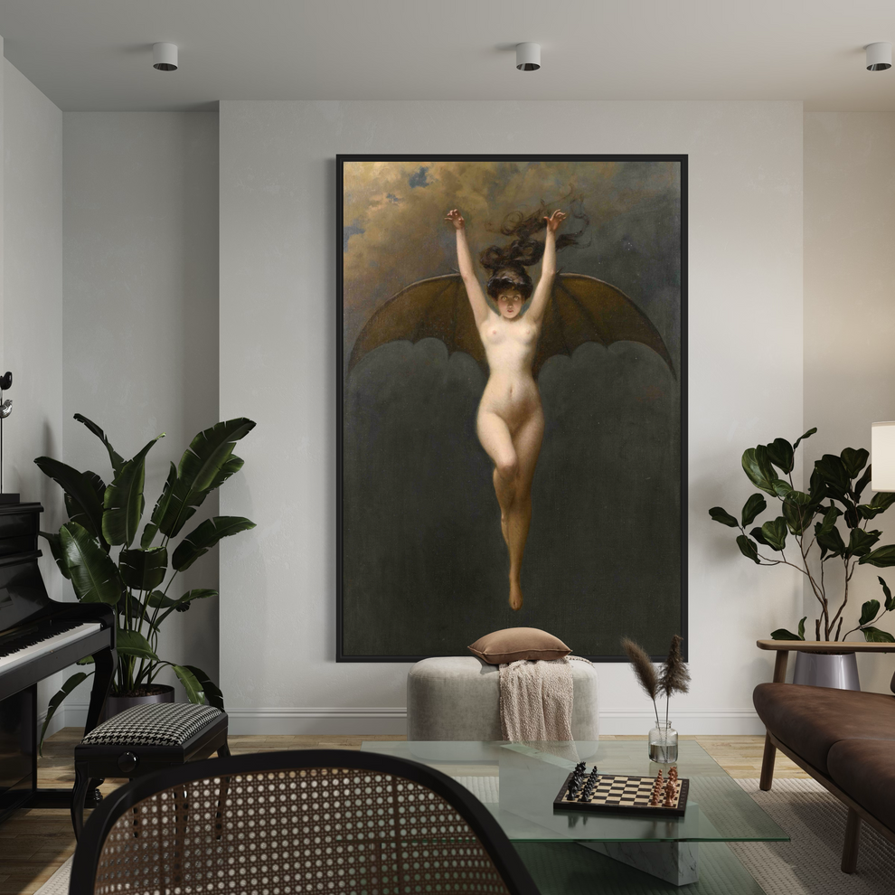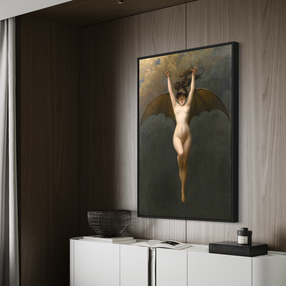 О картине: «Женщина-летучая мышь» Альбера Жозефа-Пено (1890) — яркий пример символизма конца XIX века, сочетающий мифологию и элементы сюрреализма. На полотне изображена женщина с крыльями летучей мыши и лицом, которое одновременно притягивает и тревожит. Этот образ создаёт атмосферу мистической загадки и тёмного очарования.