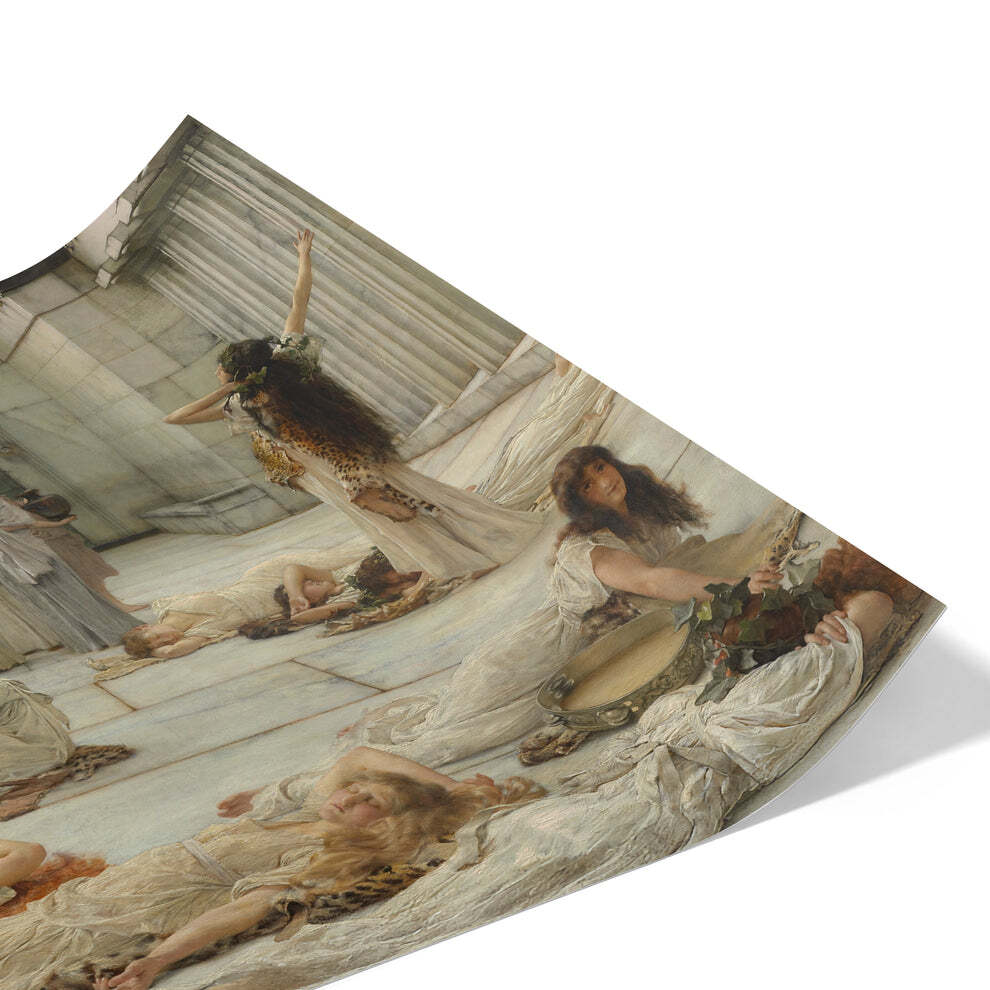 Картина изображает женщин города Амфиссы, которые оказывают защиту и гостеприимство менадам — жрицам Диониса, случайно забредшим в их город после безумного ритуала. Альма-Тадема с поразительным натурализмом передаёт этот момент культурной встречи: обнажённые фигуры, мраморные ступени и залитая солнцем архитектура наполнены теплом и интимностью.