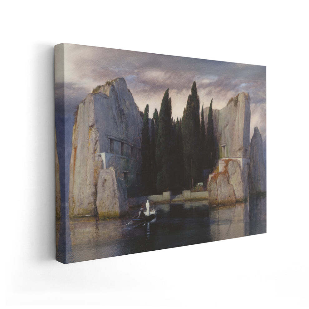 На картине изображён таинственный остров, окружённый тёмной, неподвижной водой. Центральным элементом становится лодка, в которой фигура в покрывале сопровождает гроб — символ вечного пути в загробный мир. Величественные кипарисы и суровые скалы острова усиливают ощущение траура и вечности.