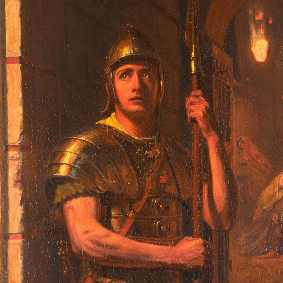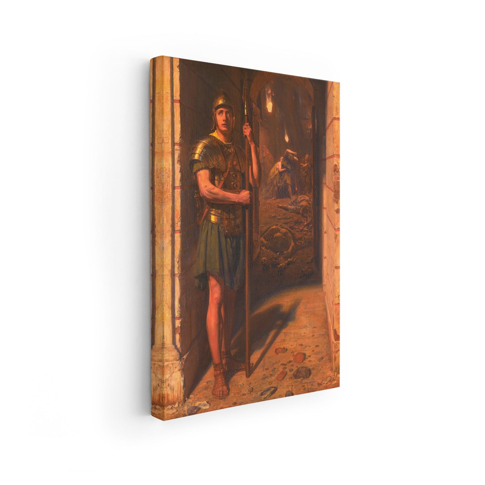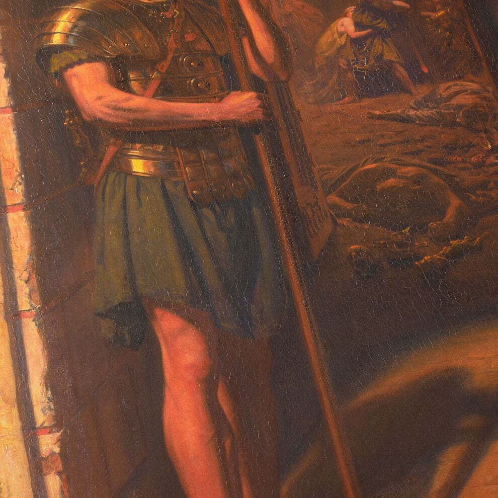 О работе: Картина сэра Эдварда Пойнтера «Верность до смерти» (1865) отражает напряжение между человеческой хрупкостью и непреклонным чувством долга. Художник изображает одинокого римского воина, который не покидает свой пост во время извержения Везувия.