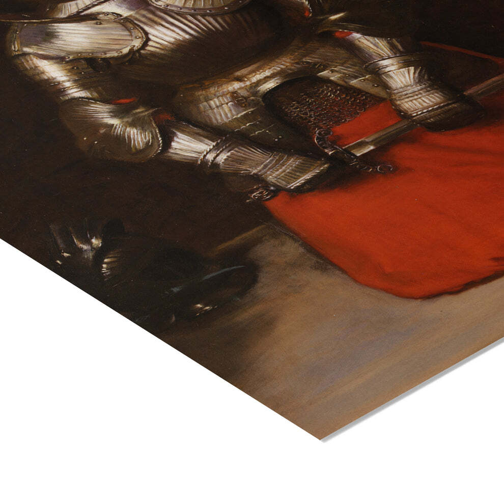 Воин стоит гордо и непоколебимо, облачённый в украшённые доспехи и венчанный изысканным шлемом, символизирующим его статус и идентичность. Свет и тень подчеркивают его мощное телосложение и уверенный взгляд, создавая образ стойкости и решимости.