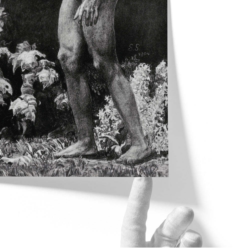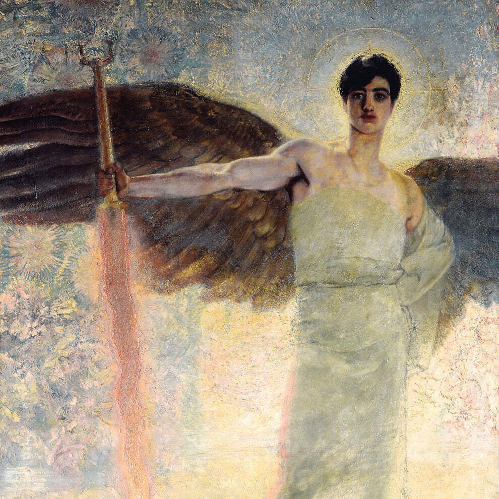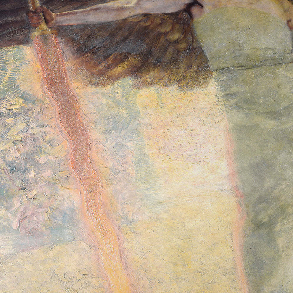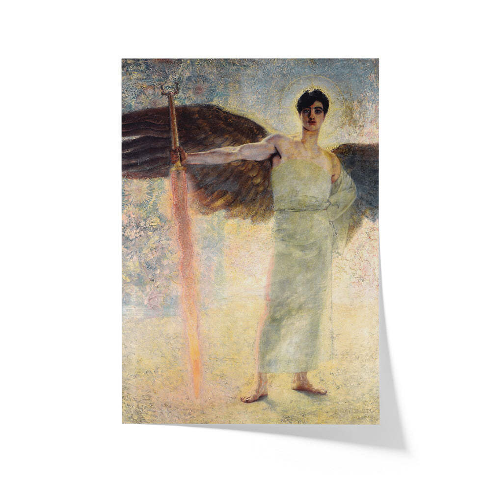 О работе: На картине мы видим могучую ангельскую фигуру — вероятно, образ херувима из книги Бытия, охраняющего вход в Эдем с огненным мечом. В отличие от традиционных изображений доброжелательных ангелов, «Страж» фон Штука излучает не умиротворение, а жуткую, властную силу. В его облике подчёркивается не милосердие, а Божественная власть и недосягаемость Рая. Мускулистое тело, пронзительный взгляд и золотые доспехи сочетают небесную красоту и грозное ощущение суда. Сияющий нимб и резкие контрасты света и тени создают мистическую и запретную ауру, усиливая драматизм образа. Эта работа отражает интерес фон Штука к аллегории: соединение религиозного нарратива с чувственной и психологической глубиной. Художник ставит зрителя перед вечными вопросами — о грехе, изгнании, недостижимом идеале и Божественном суде.