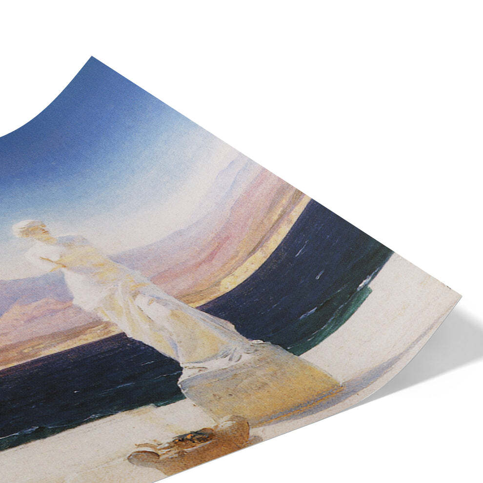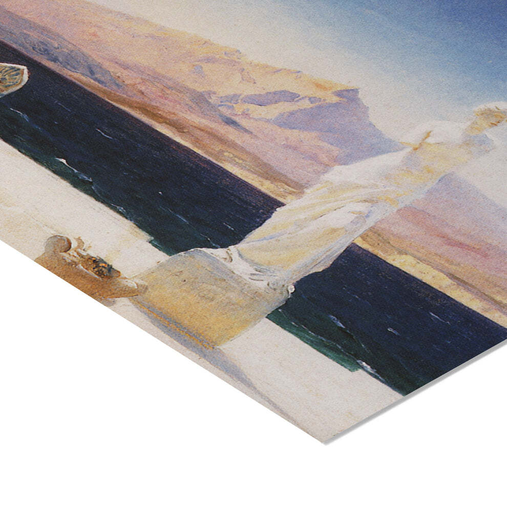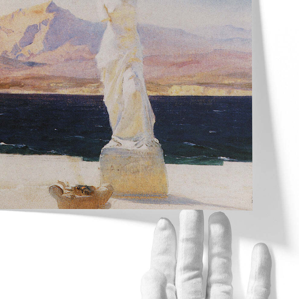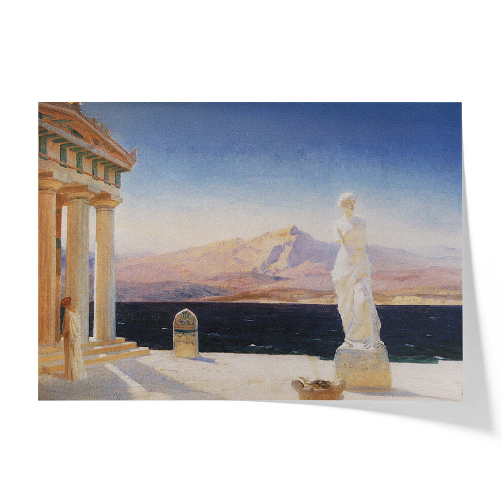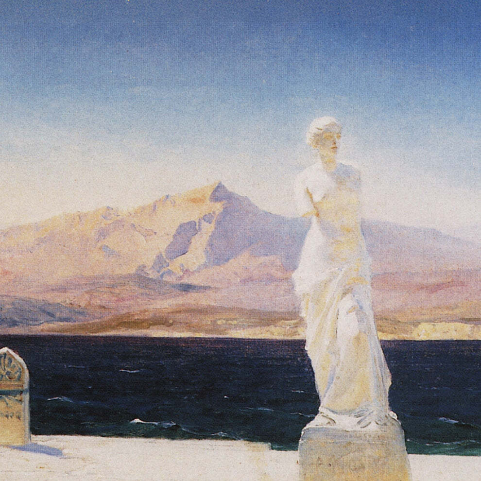 Слева возвышается дорический храм, отбрасывающий длинные тени, у его ступеней стоит одинокая женская фигура в белой тунике, задумчиво глядя в тишине. Справа мраморная статуя — напоминающая Венеру Милосскую — обращена к зрителю, на фоне тёмного моря и освещённых солнцем гор.