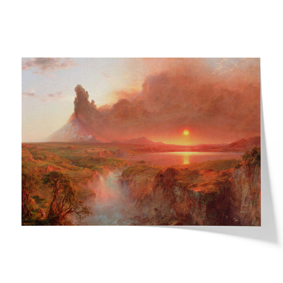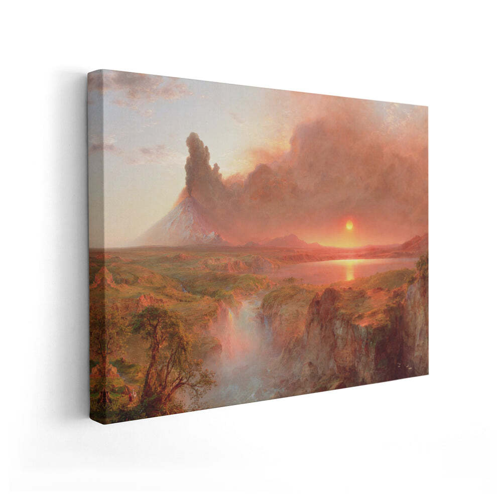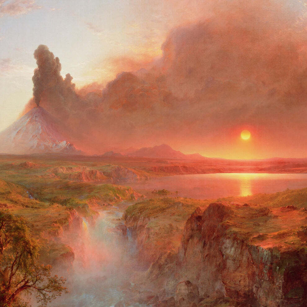 О картине: «Котопахи» — картина Фредерика Эдвина Чёрча, написанная в 1862 году, и одно из самых впечатляющих изображений вулкана в искусстве. Перед зрителем разворачивается величественная и драматическая сцена: снежная вершина вулкана окутана клубами дыма и пепла, а по склонам стремительно стекает раскалённая лава, заливая пейзаж ярким огненным светом.