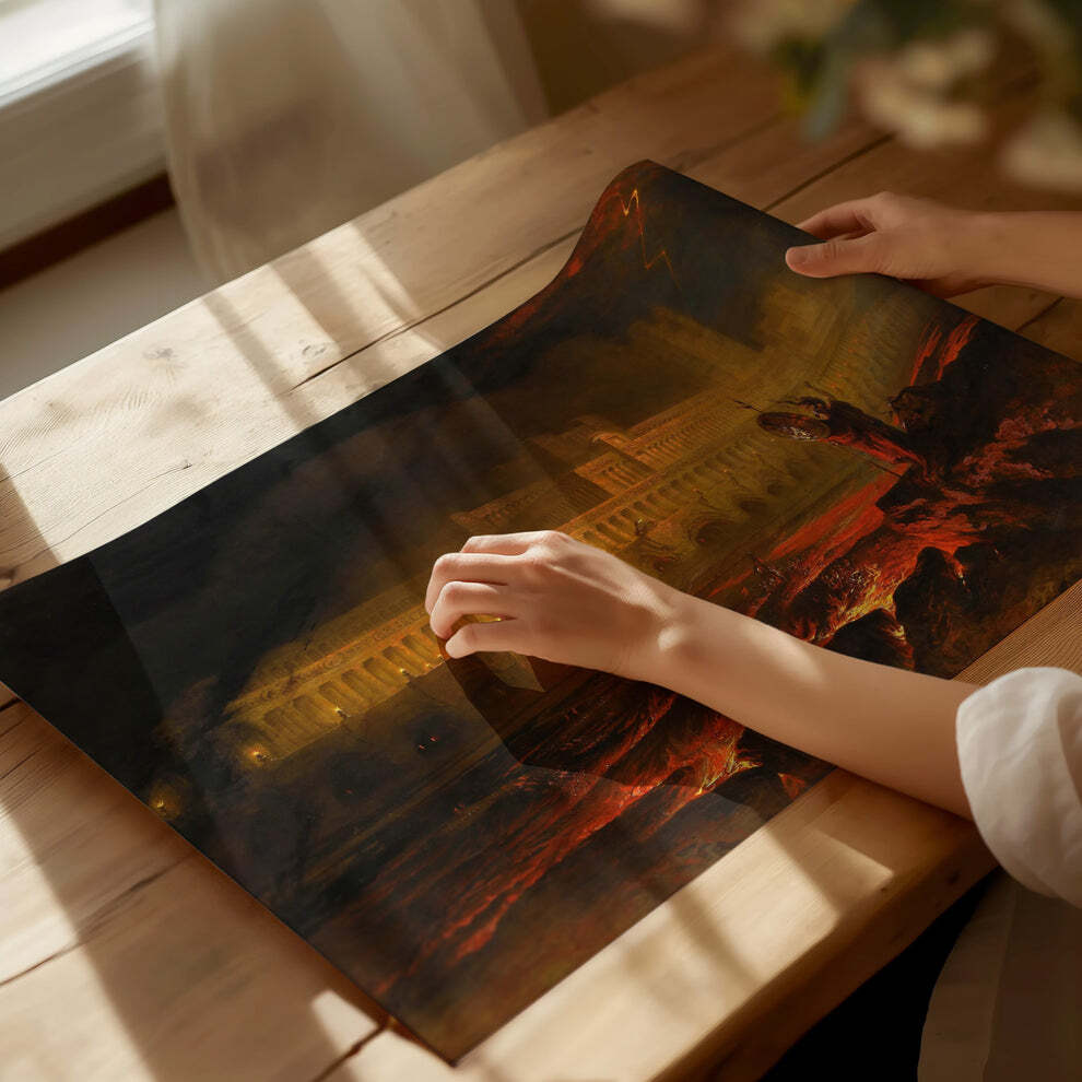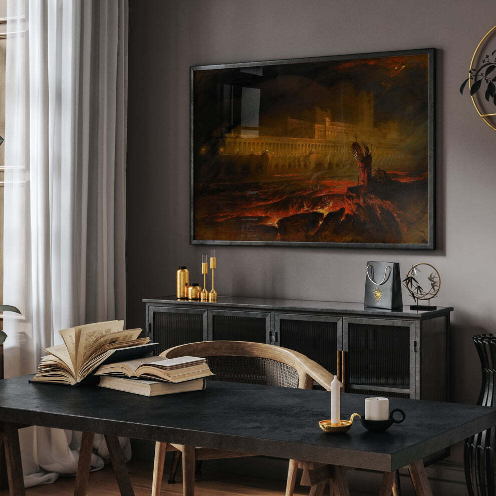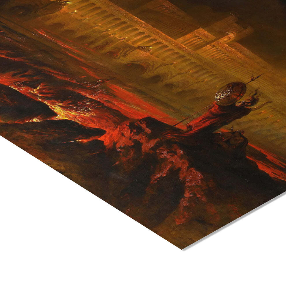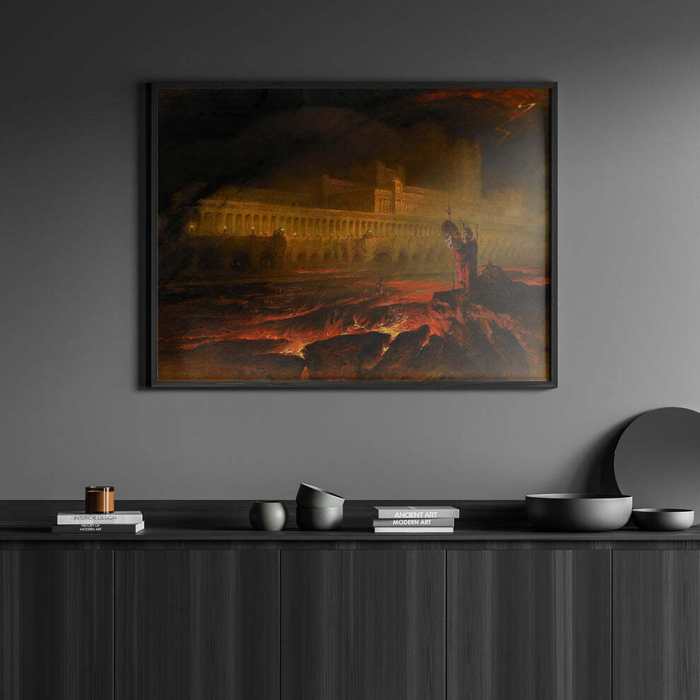 Полотно поражает своей динамикой и масштабом: горящие башни, клубы дыма и мрака, толпы демонических существ и фантастических созданий наполняют пространство, создавая ощущение ужаса и безысходности. Мартин виртуозно играет светом и тенью, усиливая драматический эффект, а тщательная проработка архитектурных деталей и грандиозных форм рождает чувство величия и ужаса одновременно.