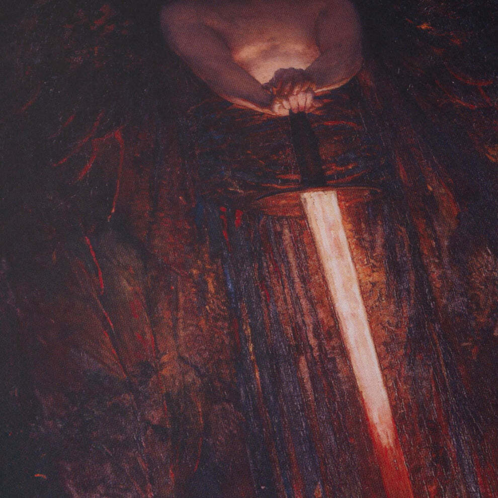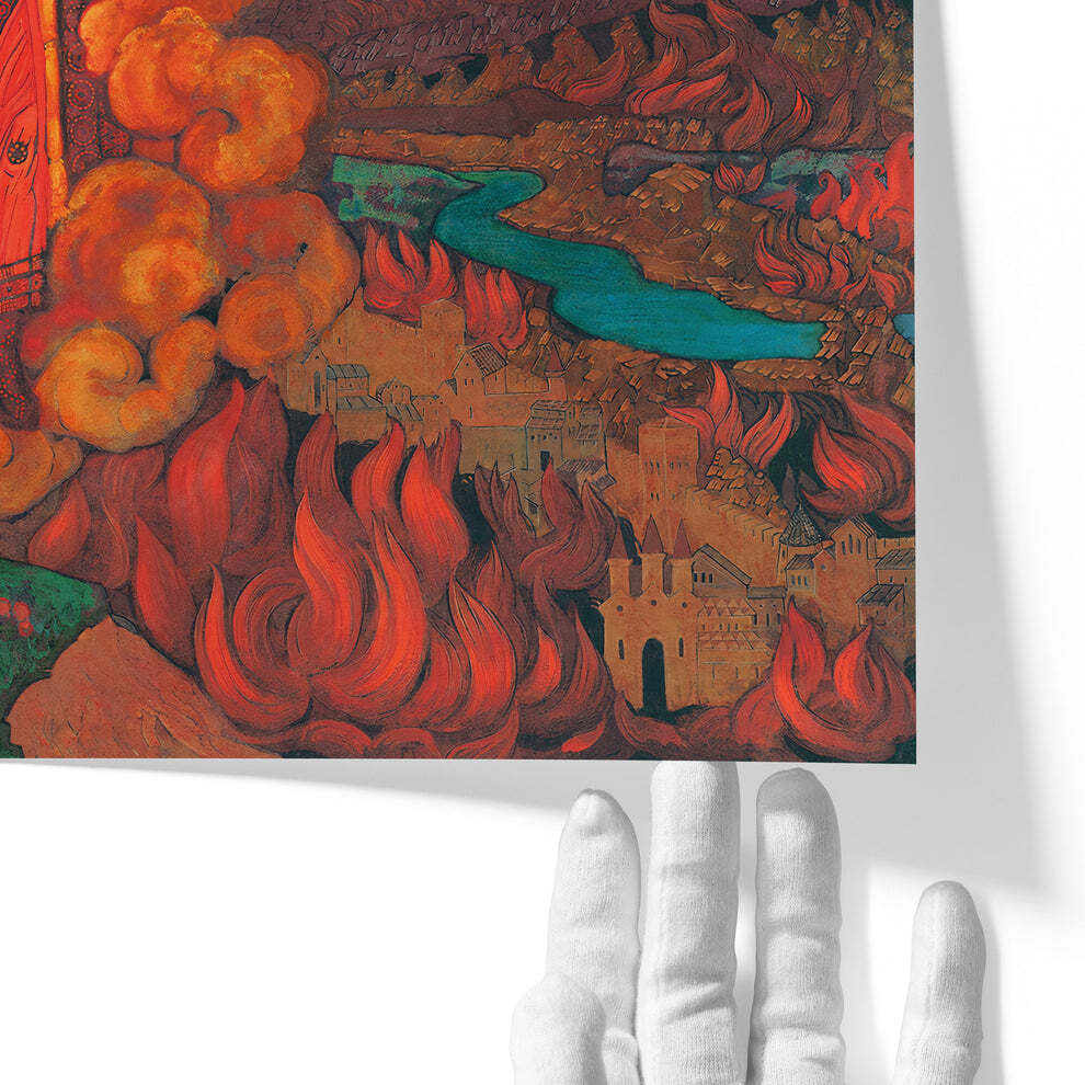 Окутанный развевающимися одеждами и держащий меч или трубу — символы божественного воздаяния — этот образ доминирует в композиции, его светящееся присутствие резко контрастирует с обугленными руинами и огненным небом.