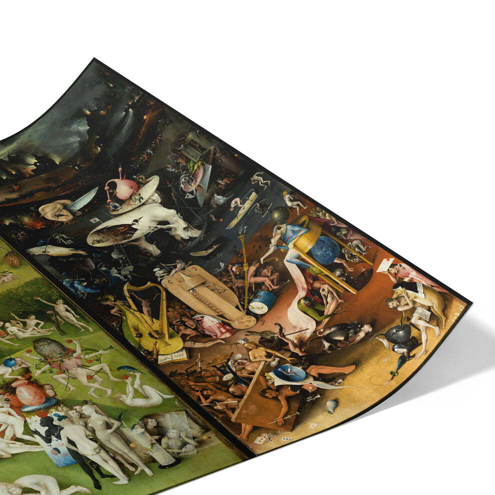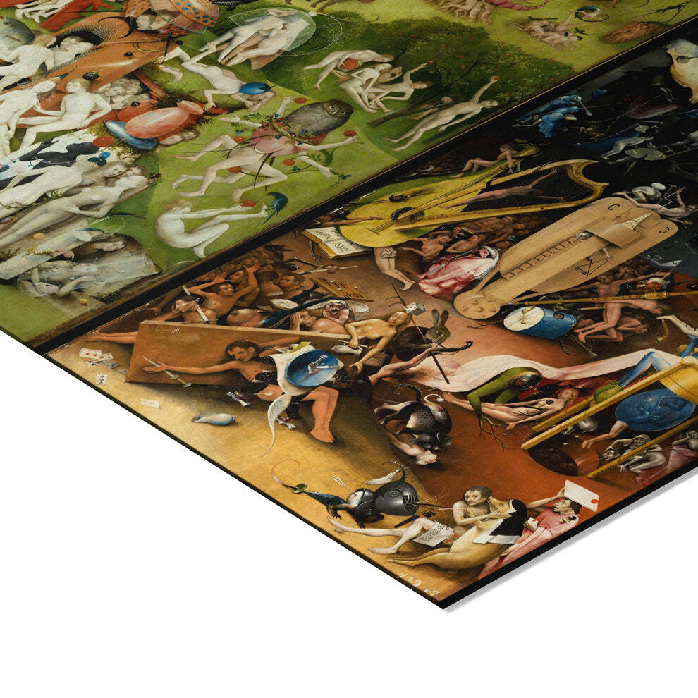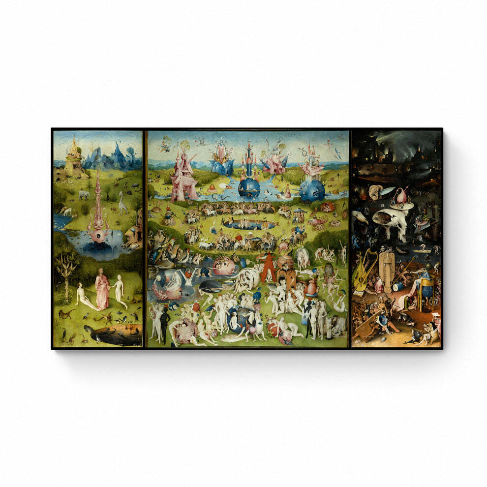 Левая створка переносит нас в идиллический райский сад с Адамом и Евой — символ невинности и гармонии. Центральная часть — бурлящий калейдоскоп человеческих и животных фигур, погружённых в удовольствия, соблазны и пороки.
